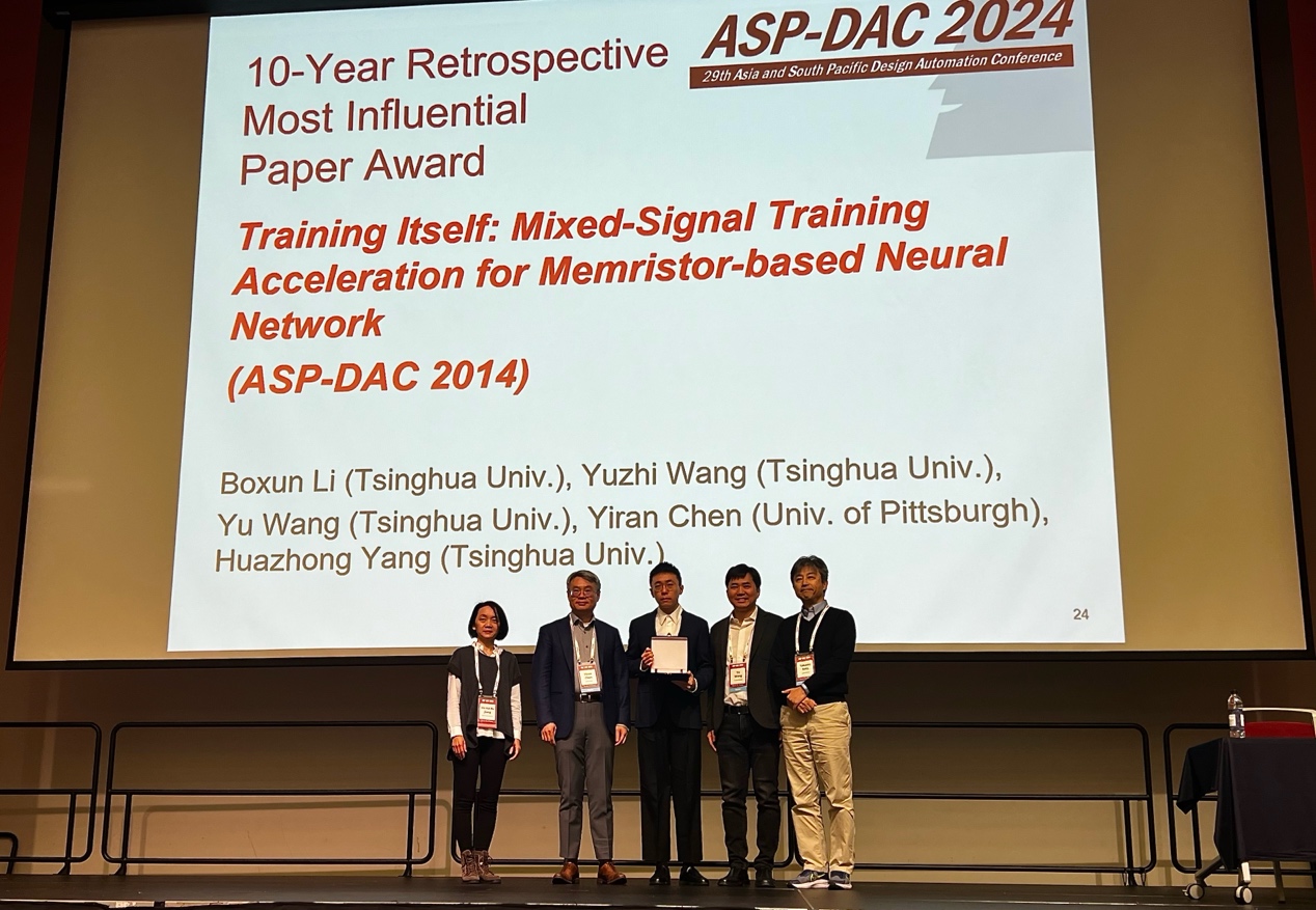 华体会娱乐(中国)网1月30日电 1月22日至25日,由国际电气电子工程师学会(IEEE)主办的2024年亚洲及南太平洋设计自动化会议(IEEE ASP-DAC 2024)在韩国仁川举行,全球设计自动化领域的400余位研究者参会。华体会娱乐平台电子工程系教授杨华中、汪玉于2014年发表在ASP-DAC会议的论文“自训练:面向基于忆阻器神经网络加速器的混合信号训练加速”(Train Itself:Mixed-Signal Training Acceleration for Memristor-based Neural Network)荣获该会议十年回顾最具影响力论文奖。