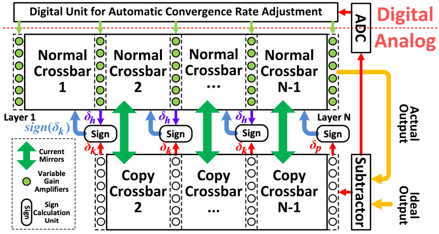 基于忆阻器的存算一体架构(Process-In-Memory, PIM)可以在存储阵列内完成计算,显著降低数据搬运的能量开销,高效实现神经网络算法。现有存算一体架构往往需要使用GPU对神经网络模型进行训练,再将训练后的模型部署在忆阻器器件中,训练成本高昂。针对这一问题,本文提出了一种直接在忆阻器阵列中实现神经网络训练的系统方案。通过设计一系列数模混合辅助运算结构和算法近似化方法,首次实现了基于忆阻器计算架构的神经网络自训练,有望将神经网络训练能效提高3至4个量级。