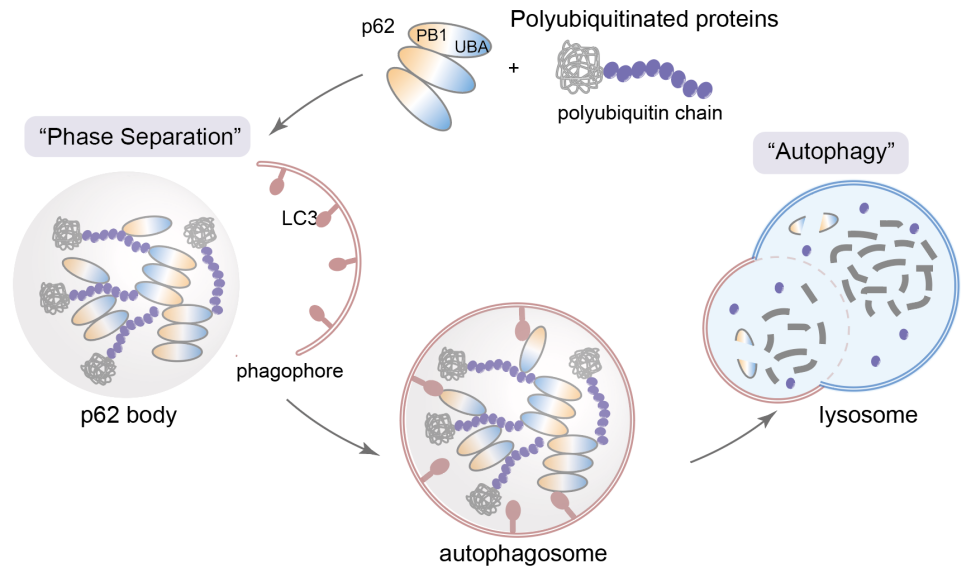 随着“液-液相分离”领域的蓬勃发展,越来越多的研究表明,在降解过程中的关键蛋白会通过液-液相分离形成降解凝聚体,这些凝聚体扮演着“降解工厂”的角色,将与降解相关的功能蛋白及待降解的底物富集在局部区室中,从而高效发挥降解功能。其中最具代表性的降解凝聚体是自噬受体蛋白p62与多聚泛素链形成的p62小体,它们为隔离膜的附着和延伸提供支点,并启动随后的自噬进程(图1)。此外,p62还参与到泛素-蛋白酶体相关的降解凝聚体中,成为蛋白酶体和自噬途径之间的桥梁。如果能特异性地将蛋白靶点招募至这些降解凝聚体中,将可能摆脱酶促反应的催化步骤(例如E3泛素连接酶的催化反应),直接通过空间距离的拉近实现有效降解。