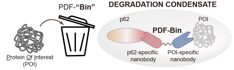 PDF-Bin取名自P62 Degradation Factory based on a BI-specific Nanobody(基于双特异性纳米抗体的p62降解工厂),由特异性结合p62的纳米抗体(Pn)、特异性结合靶标蛋白的纳米抗体和一段柔性连接子所构成。为了获得p62的纳米抗体,研究人员通过噬菌体展示技术联合显微成像共定位分析进行筛选,获得了三种特异性结合p62的纳米抗体(A1E、D9A和E12C)。将这三种Pn分别融合EGFP荧光标签的纳米抗体Gn构建而成的PDF-Bin(A1E-Gn、D9A-Gn和E12C-Gn)均对EGFP-TDP43蛋白具有较好的降解效果。
