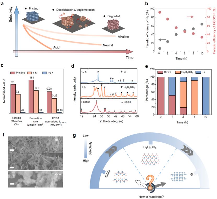 图1.酸性CO2RR中动态催化剂降解机制分析