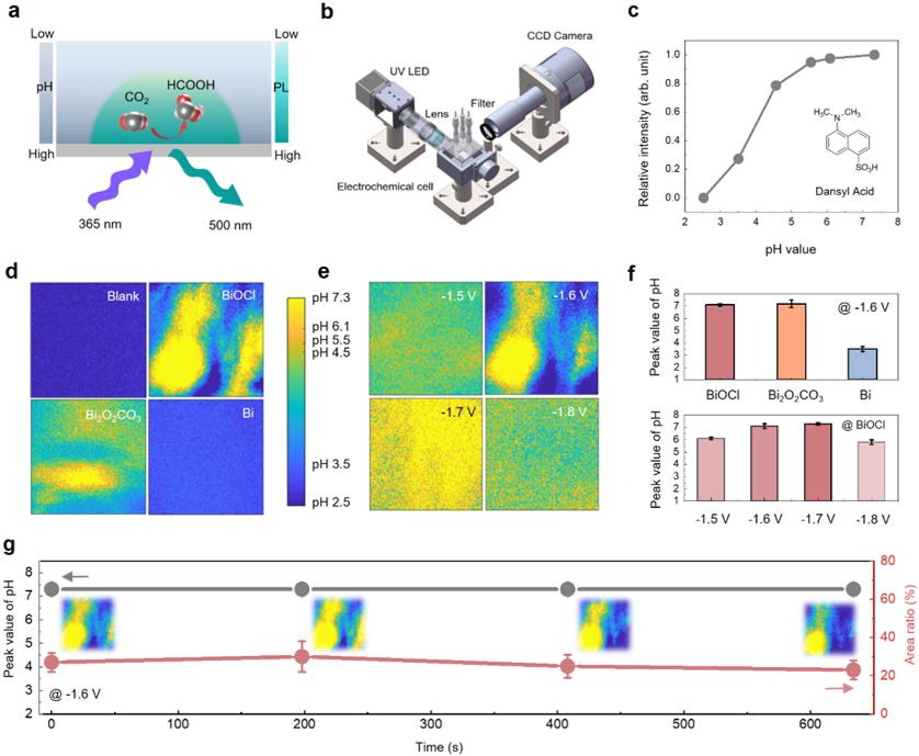 图2.原位荧光成像技术揭示催化剂表面局部pH变化