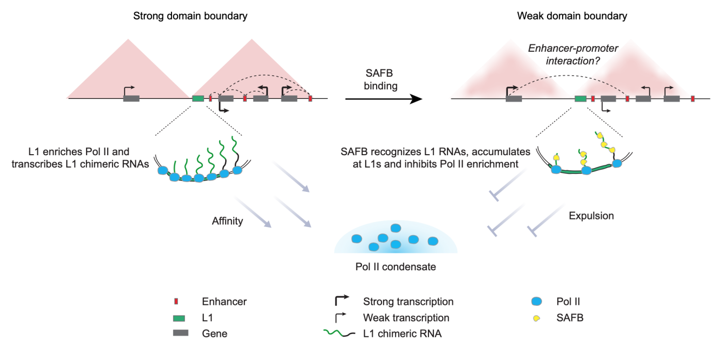 转录活跃的L1可以聚集Pol II形成TAD边界,并影响基因表达;核基质蛋白SAFB主动结合L1 RNA转录本,阻碍Pol II在L1上的聚集来抑制这一过程