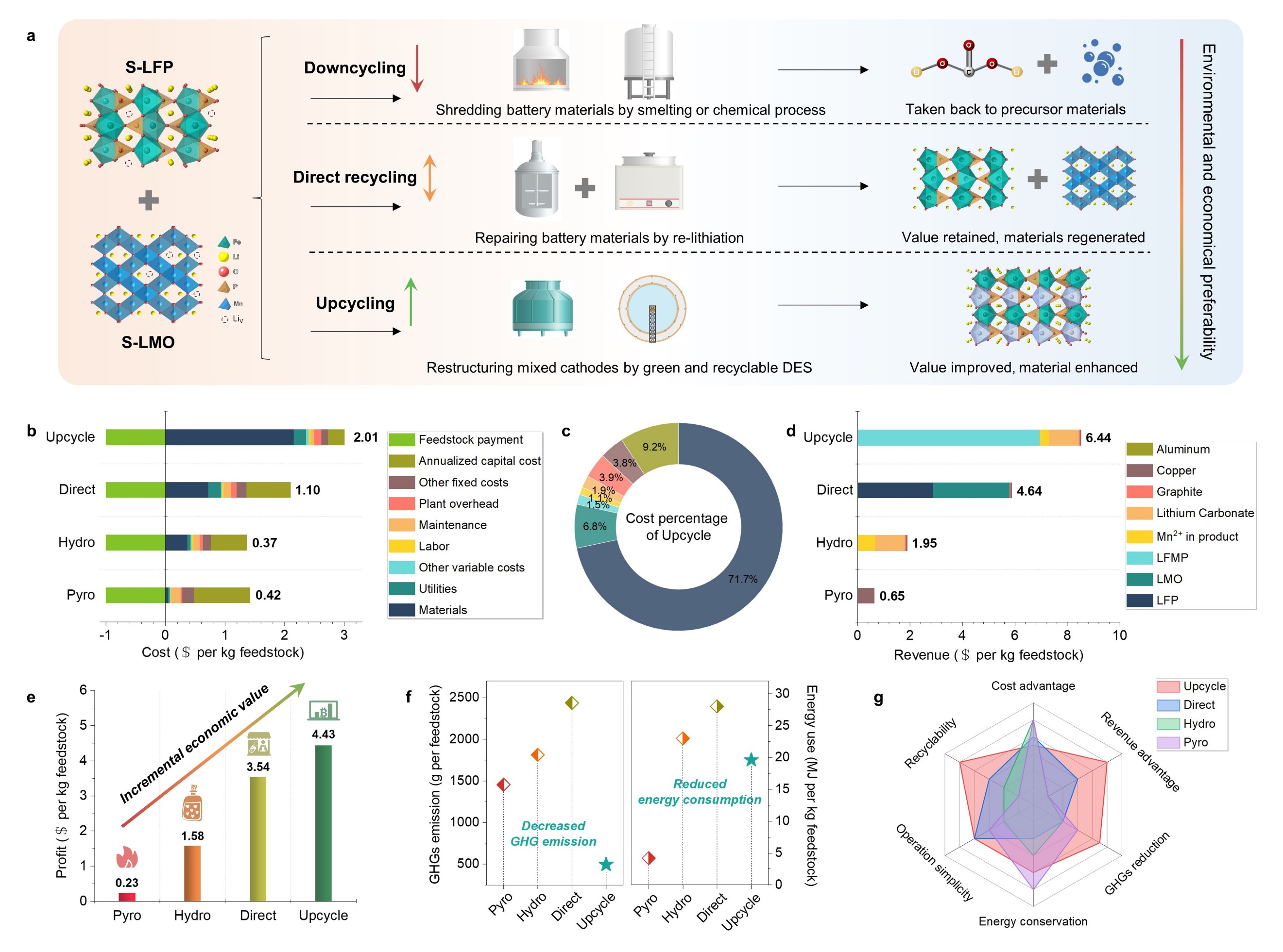 华体会娱乐平台深圳国际研究生院周光敏副教授,中国科学院深圳先进院与金属研究所、深圳理工大学(筹)成会明院士,上海交通大学梁正副教授团队提出了一种针对混合失效正极材料(LFP+LMO)的升级回收策略,以绿色环保的低共熔溶剂为介质,通过结构调控和过渡金属替换,将其转变为更高能量密度的聚阴离子型正极材料。再生磷酸锰铁锂正极材料的中值电压和能量密度分别提升至3.68V(相对于Li/Li+)和559 Wh/kg,均高于商业LFP(3.38 V和524Wh/kg)。该策略可以实现混合正极中的全元素回收和溶剂的循环利用,同时可扩展合成其他高电压磷酸盐材料。经济性分析表明,升级回收策略具有更高的经济和环境效益,为回收低价值的混合正极材料升级为下一代正极材料提供了一种新思路。
