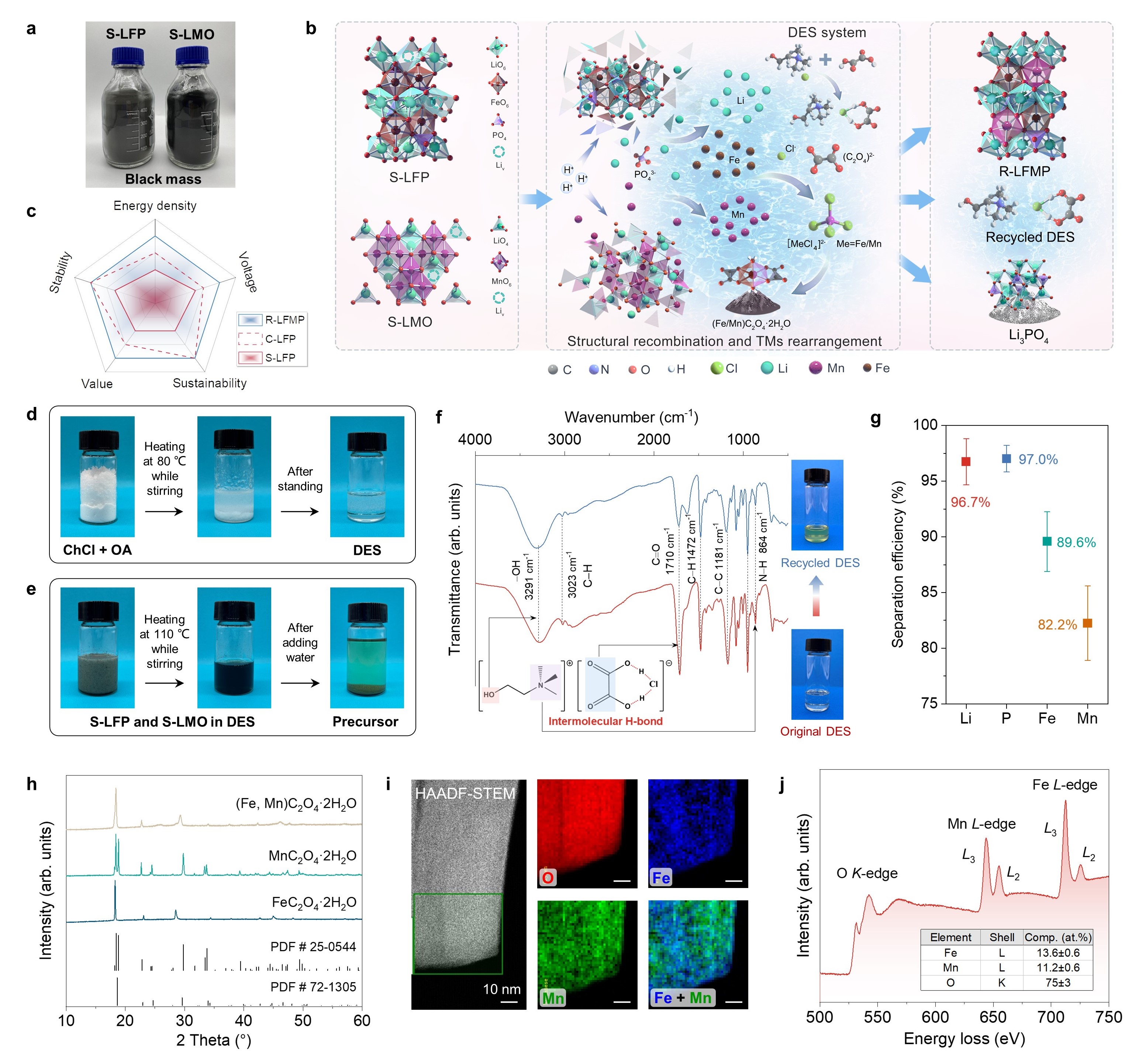 华体会娱乐(中国)网5月23日电 近年来,锂离子电池(LIB)的可持续回收逐渐成为业内关注焦点。在电池的所有组分中,正极材料占据最大重量并主导了电池成本,其回收再利用刻不容缓。商业正极材料包括橄榄石型磷酸铁锂(LFP)、层状钴酸锂/三元材料以及尖晶石锰酸锂(LMO)。因为这些正极具有不同的晶体结构,目前的直接回收方法主要针对单一特定成分,同时处理多种正极材料仍面临很大挑战。传统火法或湿法回收通过高温熔炼或化学过程破坏电池材料,并需要复杂的步骤来分离不同的元素,导致二次污染。更重要的是,失效LFP或LMO电池中的有价元素含量低,而这些方法产生的Fe/Mn产物具有较低经济价值,因此需要发展更好的回收技术来实现混合正极材料的经济回收。