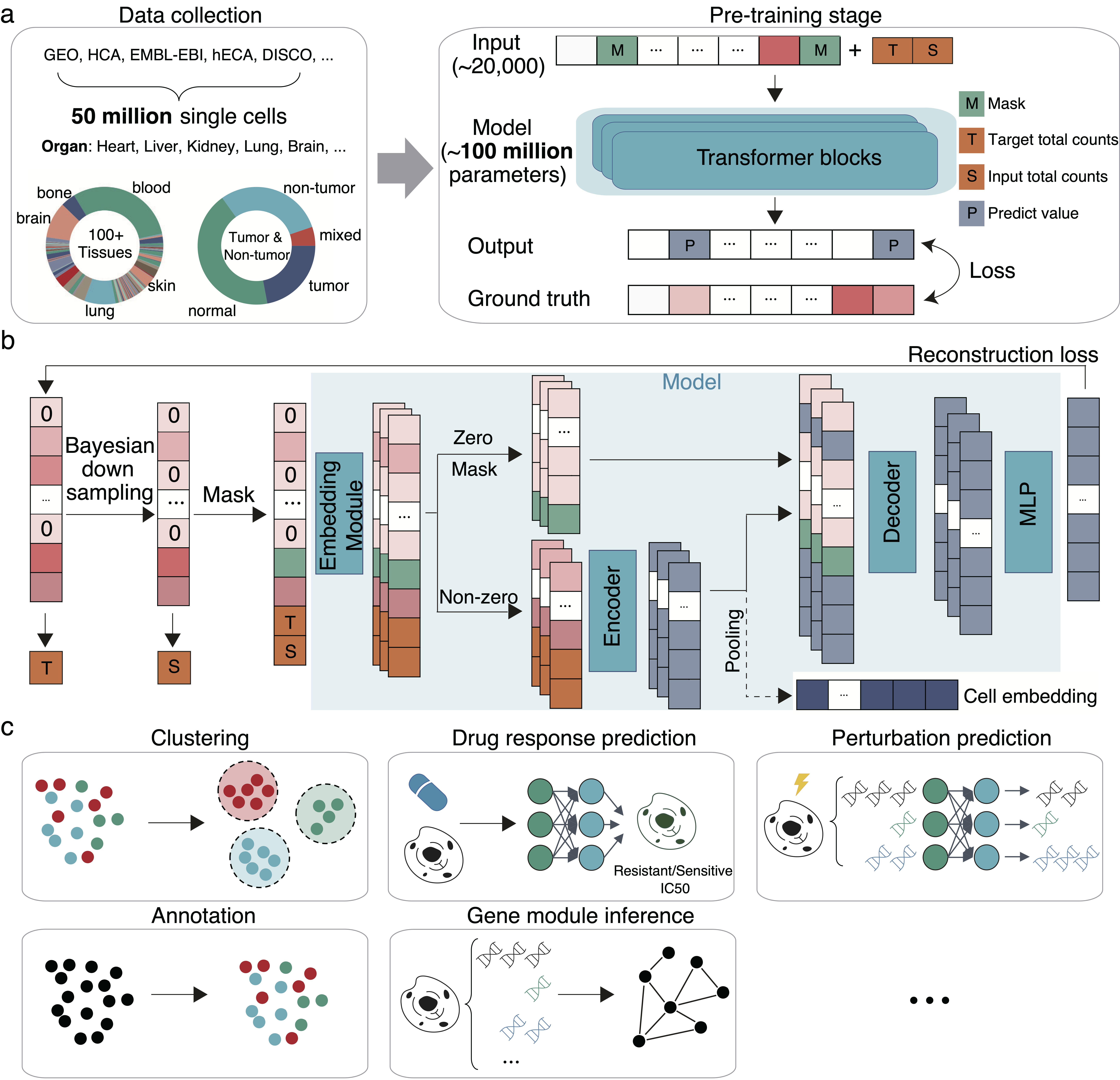 华体会娱乐平台自动化系生命基础模型实验室主任张学工教授、电子系/AIR马剑竹教授和百图生科宋乐博士合作,建立了一个名为scFoundation的细胞大模型。该模型基于5000万个细胞的基因表达数据进行训练,拥有1亿参数,能够同时处理约20000个基因。作为基础模型,它在“虚拟药物试验”等多种生物医学下游任务中表现出卓越的性能提升,提供了人工智能在单细胞研究中的新范式(图1)。研究成果于2023年5月完成,2024年6月6日以“单细胞转录组大规模基础模型”(Large-scale foundation model on single-cell transcriptomics)为题,发表于《自然·方法》(Nature Methods)上。