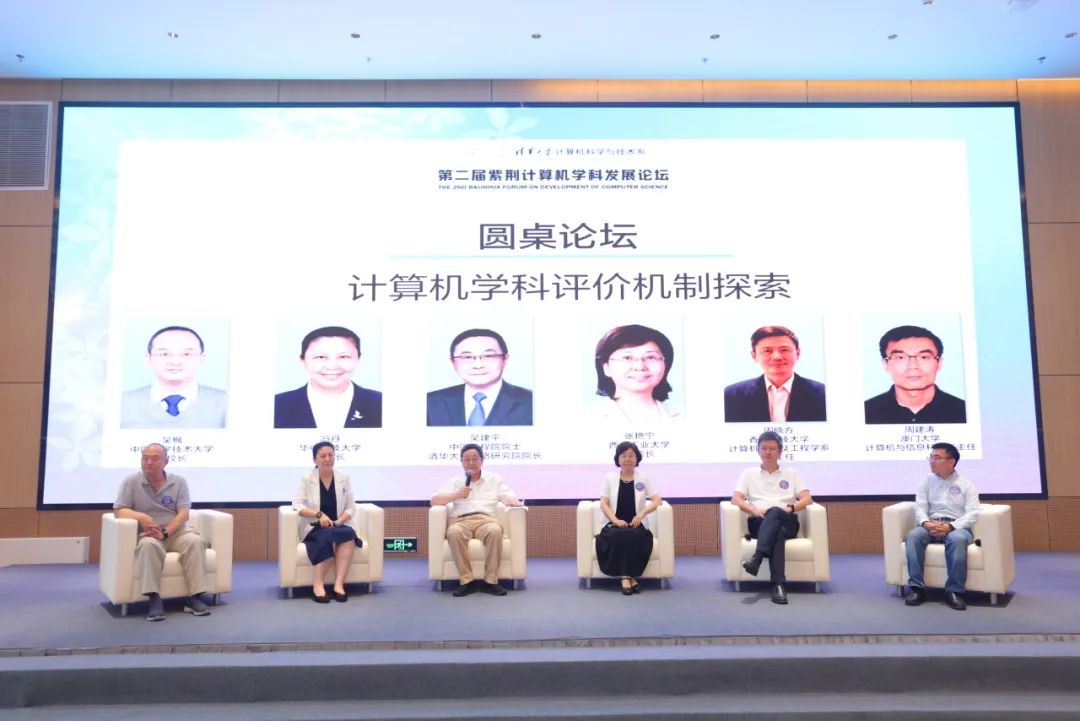 本次论坛还分设两场圆桌论坛。上午举行的“计算机学科评价机制探索”专题研讨,由吴建平院士主持。张艳宁、冯丹、吴枫、周晓方、周建涛共同讨论了新时代计算机学科评价如何根据学科发展进行完善,学科交叉和学科评价的关系,国际化大环境对学科评价的影响,以及学科评价指标与青年人才培养之间的关系等问题。