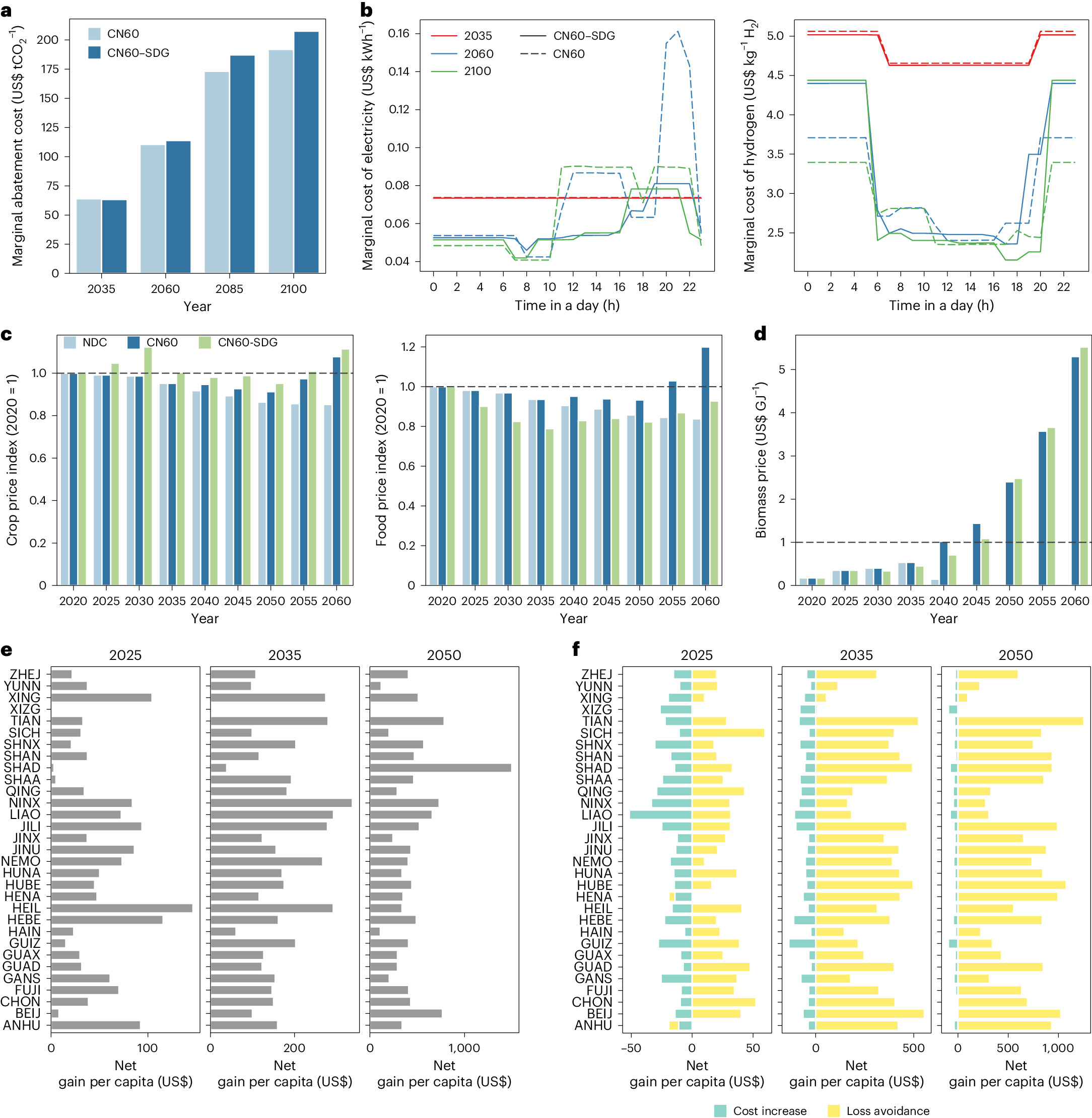 研究结果表明,中国2060年可再生能源在一次能源中的比例约66%,终端部门的燃料替代推动电力使用增加,威胁能源系统安全的风险逐渐从外部对化石燃料的依赖转向内部灵活性挑战。土地(粮食)系统的提效对于碳减排和粮食安全至关重要。2050年以后,能源作物需要大规模种植,到2100年,能源作物种植面积约占全国土地面积3%。对生物质的需求将在2060年后对粮食系统造成压力。研究识别到气候行动和水资源节约之间显著的协同关系,通过推行高效灌溉、减少食物浪费、调节膳食结构等措施能显著减少灌溉水需求。到2060年,碳中和转型带来的火电退役和空冷机组比例增加,使得冷却取水减少,从而能源系统取水量较2019年下降38%,另外,净零转型预计将减少70%的空气污染物排放,显著改善空气质量,并带来大量的健康效益。然而,单靠气候行动的协同效益无法确保实现空气质量目标,需要进一步采取严格的空气污染控制措施。
