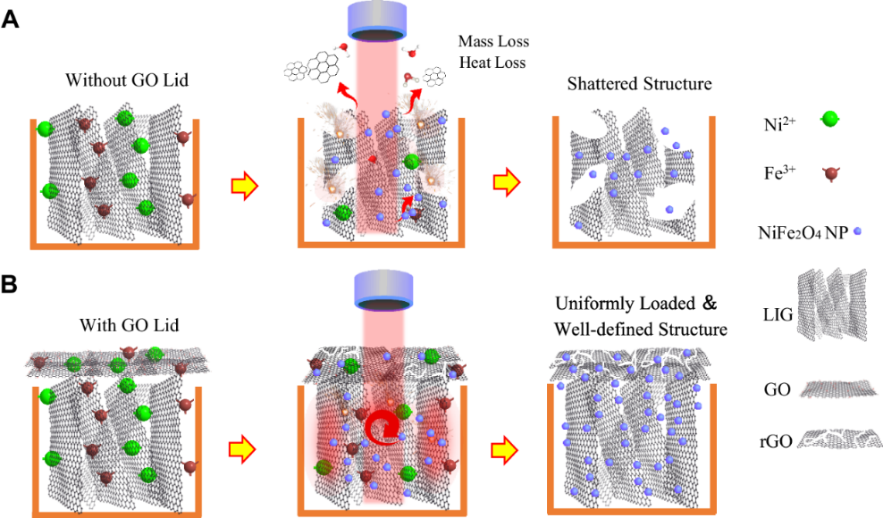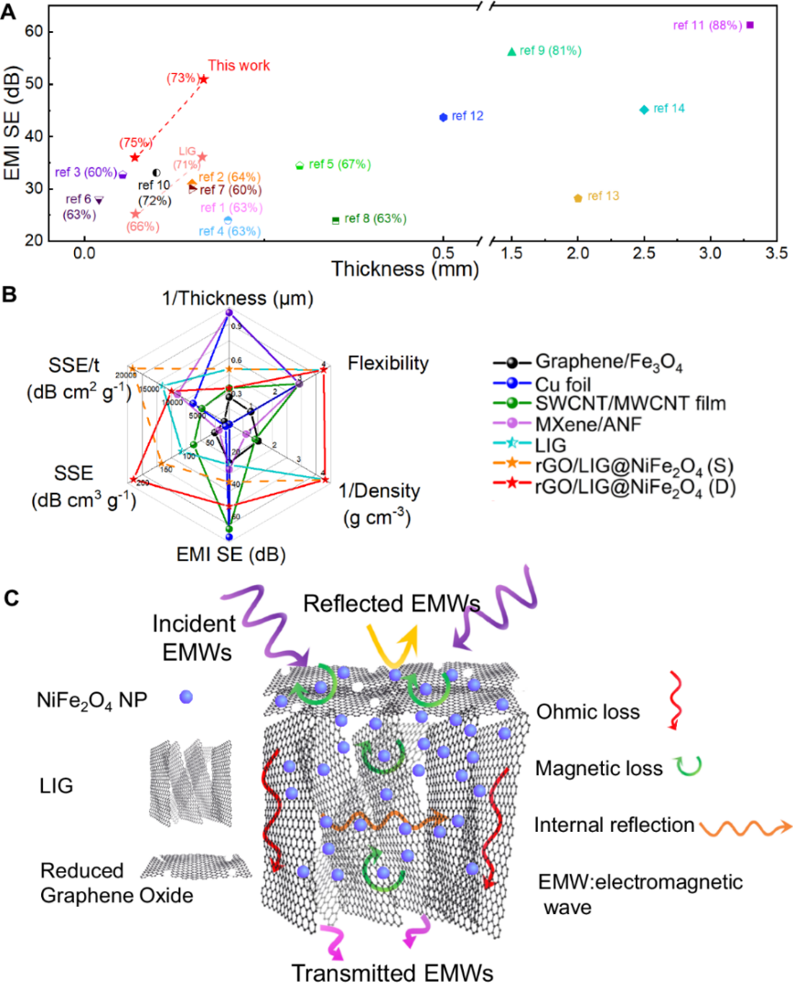 此外,课题组提出了受“爆米花制造”启发的纳米材料激光加工方法,展示了一种兼具高导电性和磁性多孔结构的复合薄膜,通过在导电多孔纳米碳宿主内均匀负载磁性纳米颗粒来最大化磁电协同效应。该策略不仅为EMI屏蔽机制和材料的发展提供了见解,而且还显示了卓越的制造通用性、小尺寸和器件可靠性。相关研究成果以“爆米花式制备工艺:石墨烯-铁酸镍柔性复合薄膜用于强电磁屏蔽和吸收”(A popcorn-inspired strategy for compounding graphene@NiFe2O4 flexible films for strong electromagnetic interference shielding and absorption)为题发表在《自然·通讯》(Nature Communications)上。华体会娱乐平台深圳国际研究生院2020级硕士生刘明杰,2021级硕士生王志远为本文共同第一作者,论文通讯作者为华体会娱乐平台深圳国际研究生院杨诚副教授。