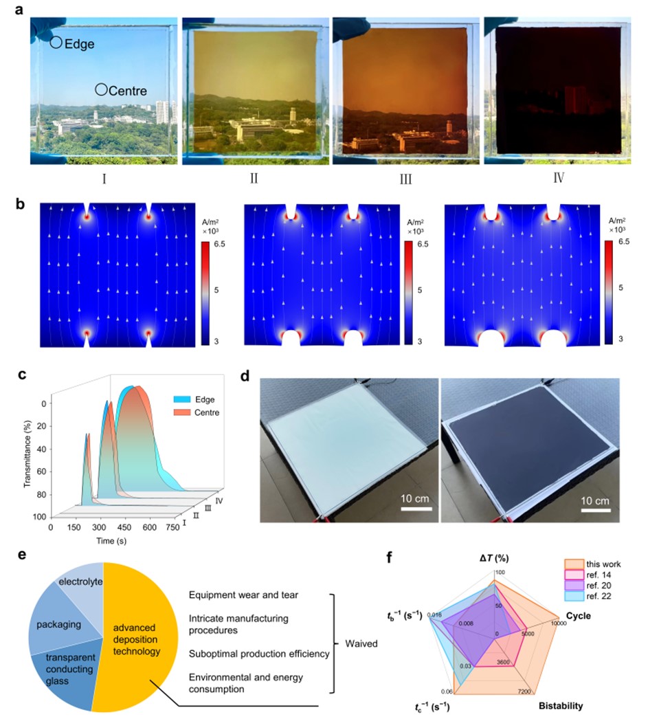 针对传统电致变色器件的商业化面临诸如高成本、复杂的制造工艺以及依赖离子嵌入/脱出机制的传统电致变色材料固有的低光学对比度等障碍。课题组提出了一种全新的双沉积溶解电致变色体系,通过阳极Cu/Cu2+和阴极MnO2/Mn2+的同时沉积和溶解来实现均匀变色,所开发出得无电极电致变色器件免除了复杂的电致变色层制备步骤。该器件在组装过程和漂白状态下均不包含电致变色层,仅由两个透明导电基底和水系电解质构成。这种极简设计的器件不仅简化了制造工艺,还展示出优异的电致变色性能,对将来进一步大规模生产尤为有利。相关研究成果以“具有快速响应和宽动态范围的电致变色窗口,无需传统电极即可实现可见光调制”(Electrochromic windows with fast response and wide dynamic range for visible-light modulation without traditional electrodes)为题发表在《自然·通讯》(Nature Communications)上。华体会娱乐平台深圳国际研究生院2021级硕士生贾卓飞、科研助理隋一明、2018级硕士生钱龙为本文共同第一作者,论文通讯作者为华体会娱乐平台深圳国际研究生院杨诚副教授。
