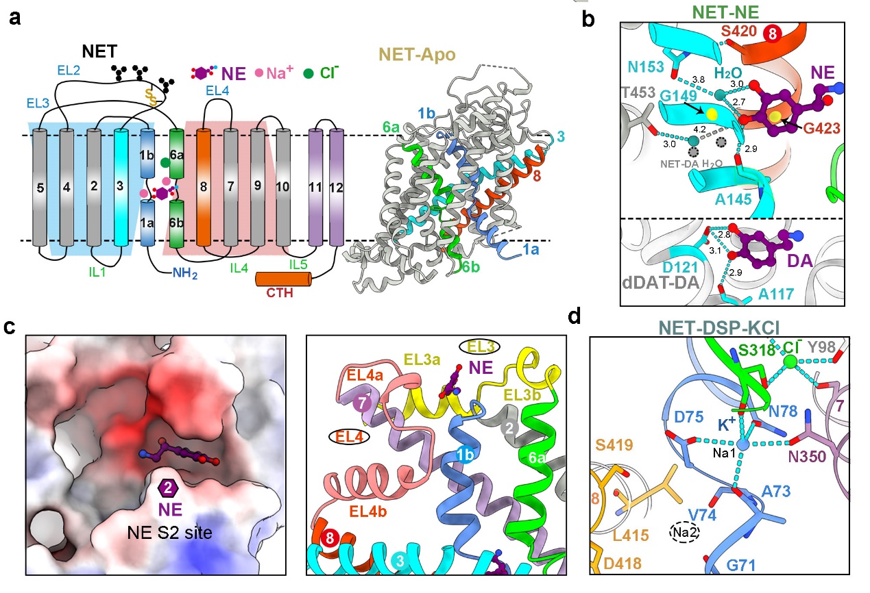研究发现,NET中央口袋S1处识别NE或DA的方式与报道的果蝇dDAT不同,其儿茶酚环上的两个羟基主要通过水介导的氢键识别(图3a,b)。此外,研究在NET与两种底物结合的结构中都观测到了第二个底物的密度(S2位点)。值得注意的是,与已报道的SERT中的S2位点显著不同,NET中的S2位点位于TM1b C末端,且仅存在于向内闭合或开放的构象中,向外开放构象转变会导致S2位点被破坏(图3c)。通过生化实验发现,S2位点内的某些突变显著影响转运蛋白的转运速度。推测NET中S2位点的功能可能是提前加载底物,从而加快底物转运效率。