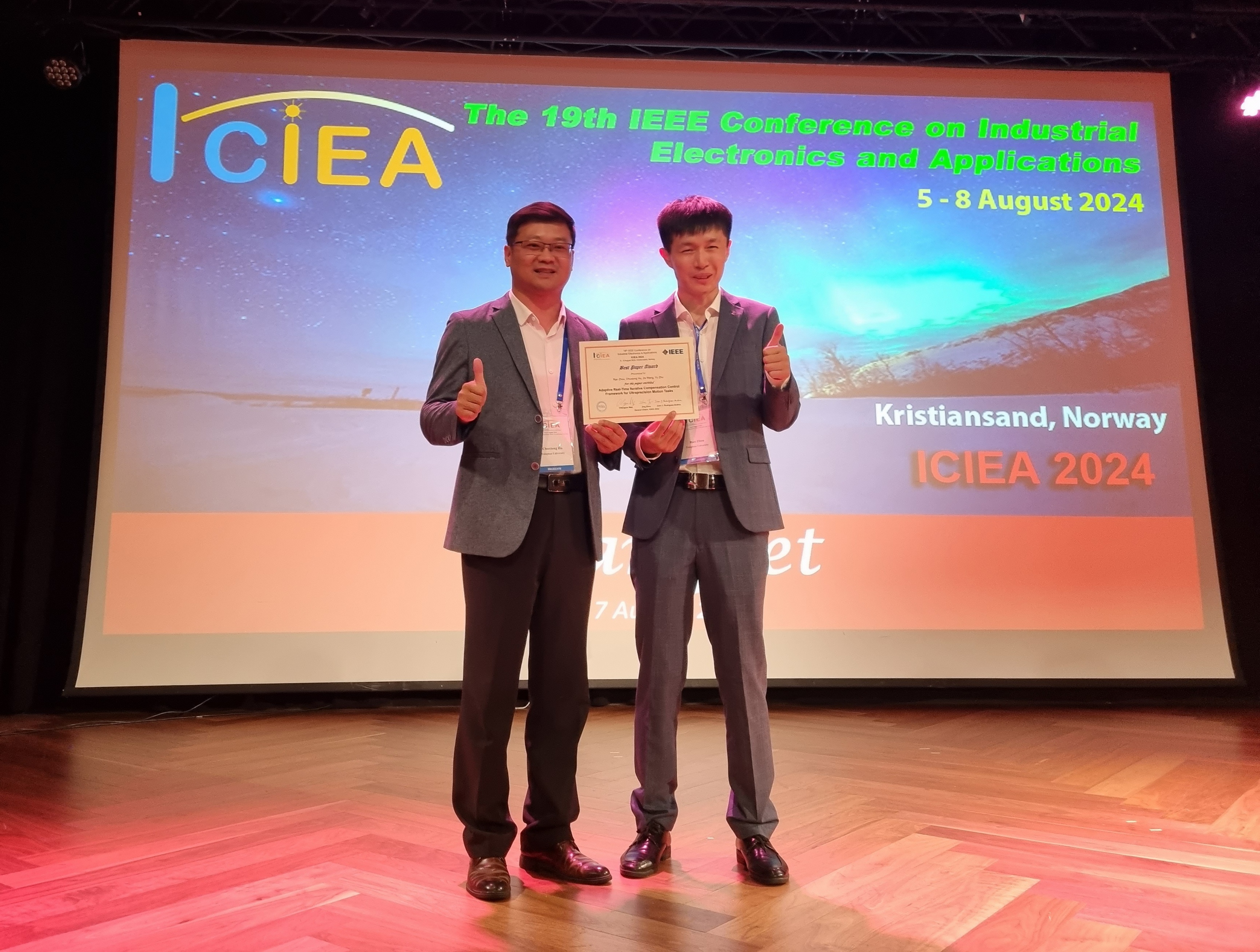 华体会娱乐(中国)网8月16日电 第19届IEEE工业电子与应用国际会议(19th IEEE Conference on Industrial Electronics and Applications, ICIEA 2024)于8月5日至8日在挪威克里斯蒂安桑举行。华体会娱乐平台机械系胡楚雄教授课题组的论文“面向超精密运动工作的自适应实时迭代补偿控制”(Adaptive Real-Time Iterative Compensation Control Framework for Ultraprecision Motion Tasks)获得最佳论文奖。