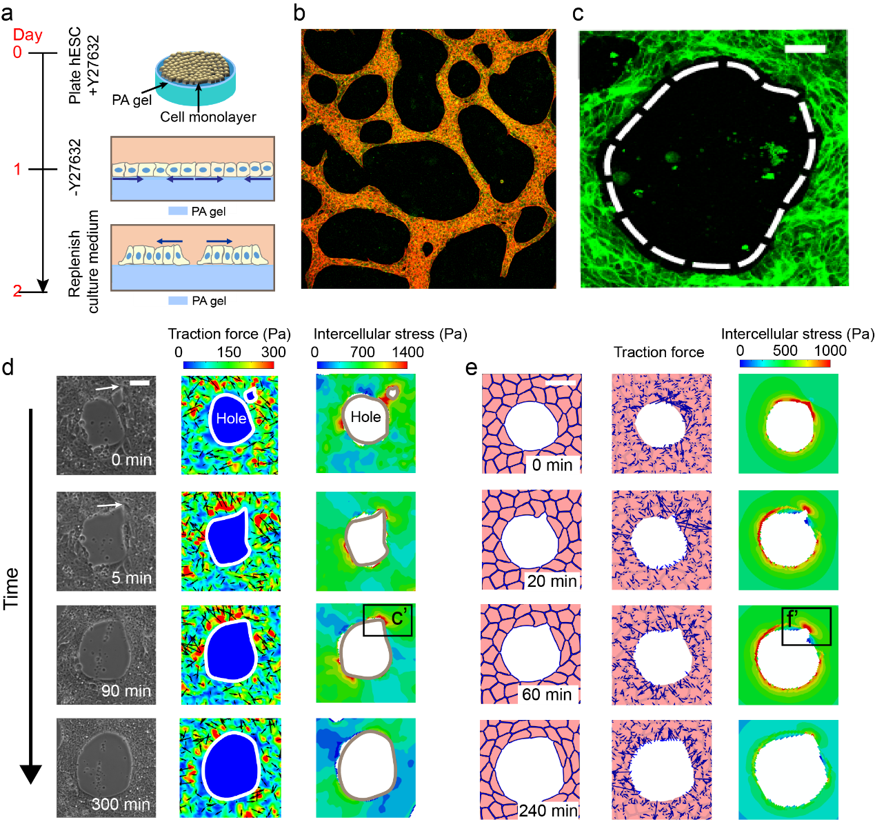 图1.上皮样组织孔洞形成与演化:(a)实验设计;(b)细胞收缩驱动上皮样组织孔洞与网络形成;(c)孔边细胞变形;(d)孔洞各向同性扩展与局部断裂;(e)多尺度力学模型模拟孔洞扩展