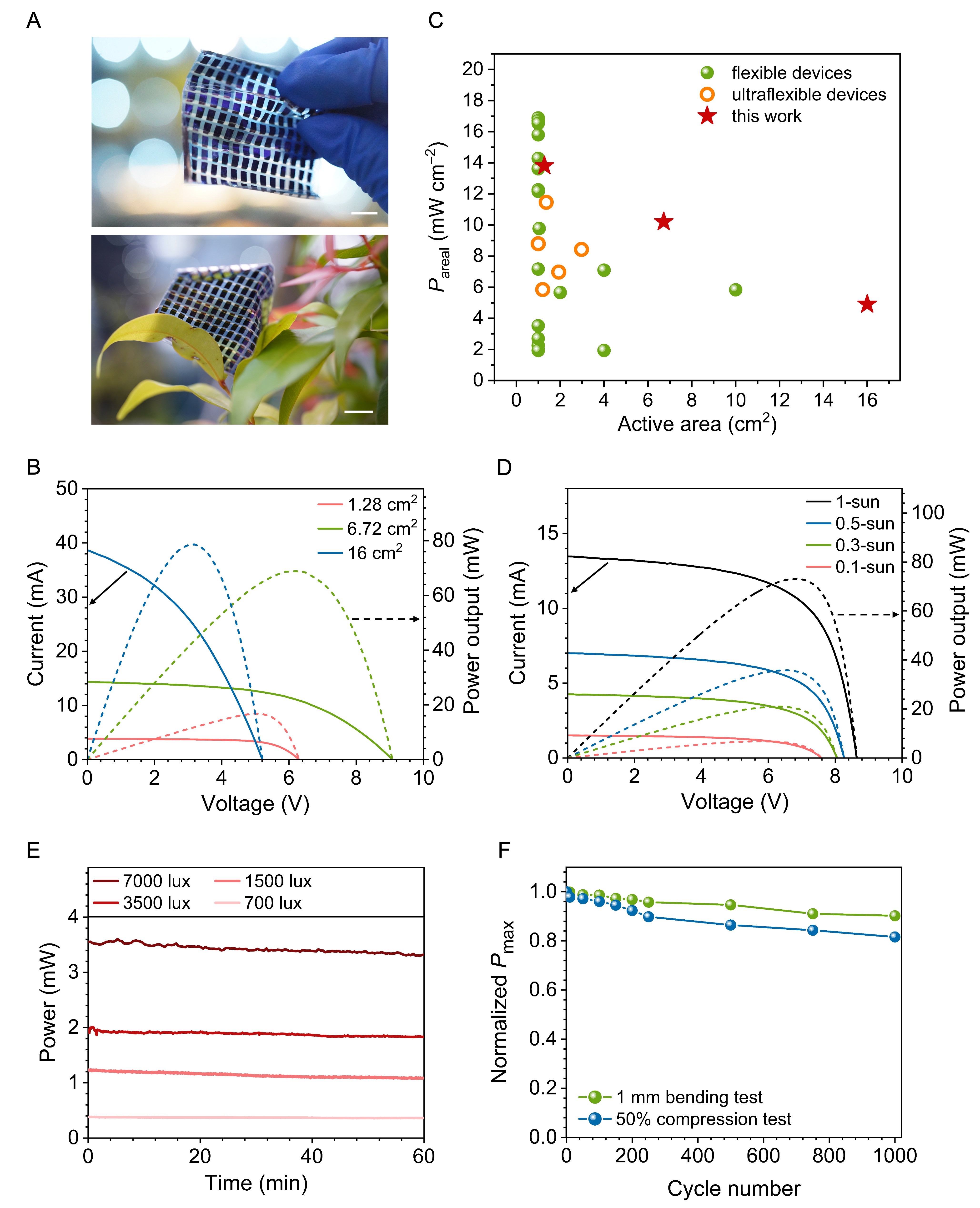基于超柔性OPV单元,研究人员进一步设计出可调功率输出的高性能OPV组件(图3)。以有效面积6.72cm2的组件为例,总光电转换效率PCE高达10.5%,峰值功率超过68.9mW,单位面积功率输出达10.2mW cm-2。此外,超柔性OPV组件在不同光照强度下具备高效的功率输出及优异的机械强度。
