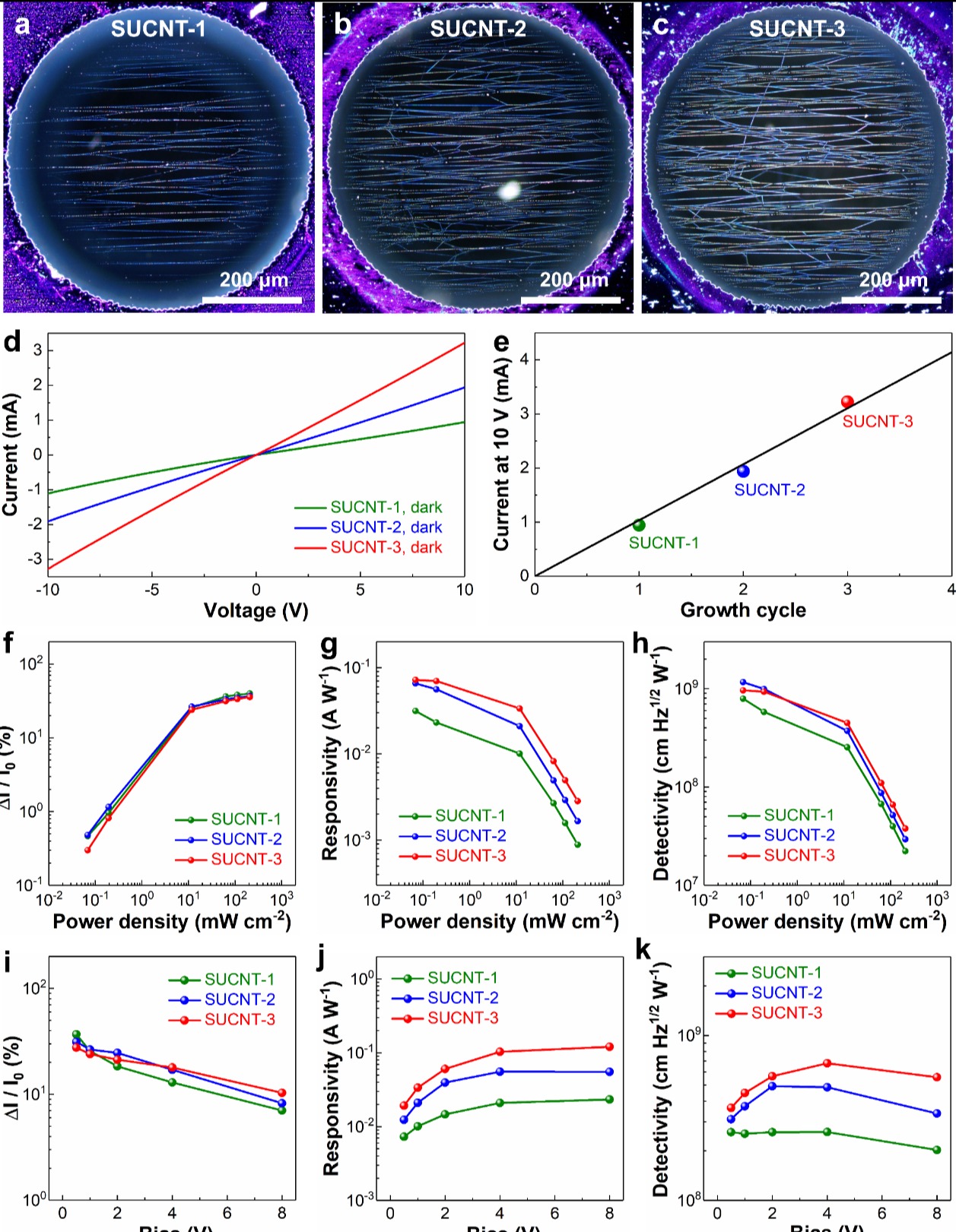 图2.不同密度的超长碳纳米管悬空网络光电探测器的性能评价