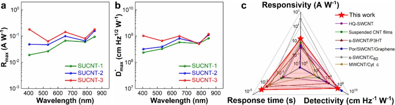 图3.超长碳纳米管悬空网络光电探测器的宽谱响应行为和综合性能对比