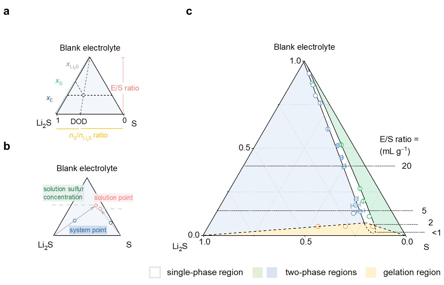 研究团队确定了锂硫电池体系的自由度数,测定并构建了由电解液−单质硫−硫化锂三组分描述的锂硫电池三元相图,建立了三元相图与实际电池体系组成之间的对应关系,并在此基础上精确地描述了锂硫电池中各相的平衡组成与浓度演变,突破了传统的光谱分析方法的限制。基于三元相图,张强团队首次指认了锂硫电池中凝胶区的存在,对应于体系在极低电解液用量下的电解液凝胶化行为和实际器件大幅增加的极化,展示了相平衡分析方法对于实际电池器件性能调控的重要意义。