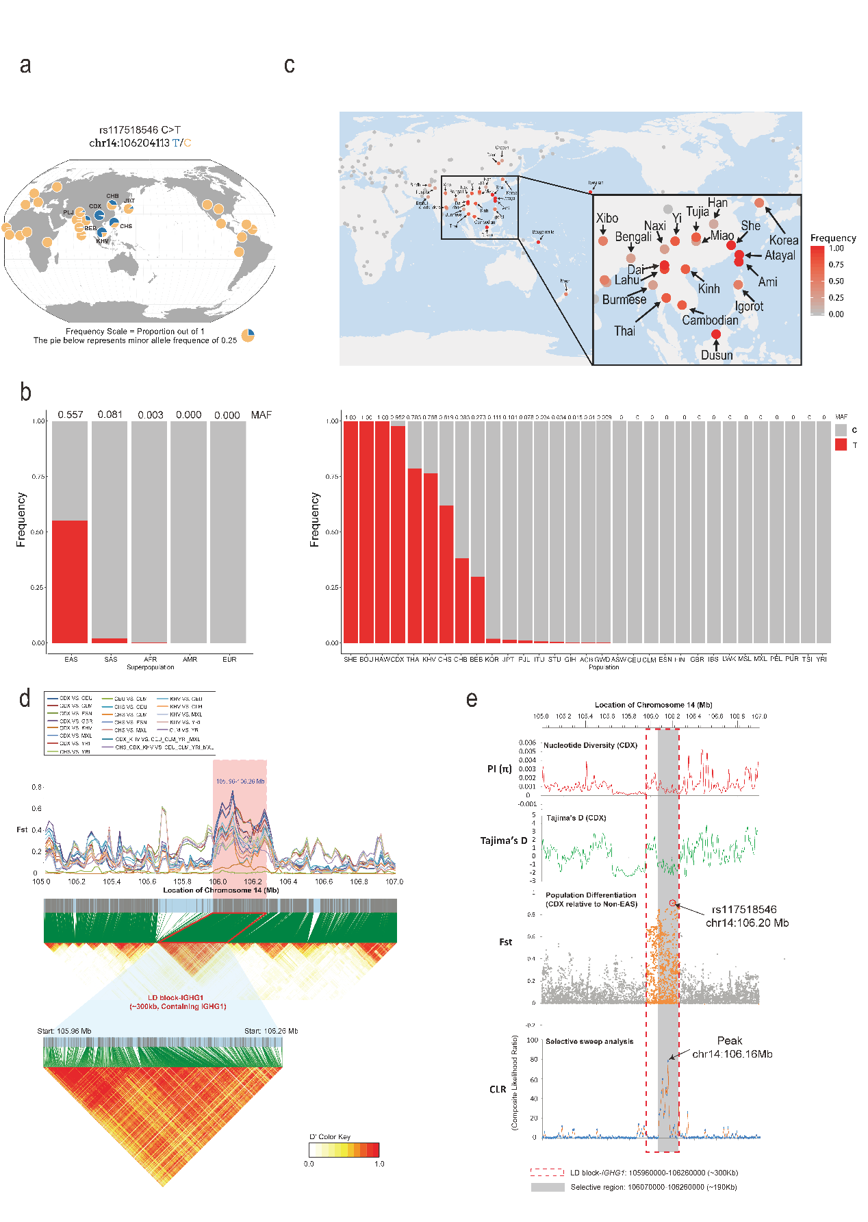 首先,项目联合研究团队分析全球不同大陆和次大陆现代人的超万人级别的大队列人群基因组数据,以及小队列但是包含142种稀少人类族群的西蒙斯基因组多样性计划数据库IgG1-G396R变异体在全球人口中出现显著两极化分布态势,其在非洲、欧洲、美洲和大洋洲的主体人口中出现频率极低,但是在布干维尔岛、夏威夷、马来西亚、中国傣族、泰国、越南胡志明市、中国南部汉族、孟加拉人群中出现频率较高。