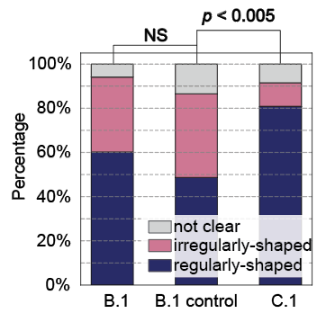为了判断异常形态病毒是否广泛存在,研究团队又对C.1毒株进行了同样的观测。这一毒株分离自中国大陆首例本土传播病例,其出现晚于B.1毒株,自2023年中逐渐成为主要流行毒株之一。研究团队发现,尽管C.1毒株也存在类似的异常形态颗粒,其出现率却显著低于B.1毒株(图5)。这表明该毒株的内核组装成功率显著提升,一定程度上反映出伴随着2022-2023年的流行传播,clade IIb猴痘病毒可能发生了适应性进化并逐渐形成了更加高效的内核组装机制。
