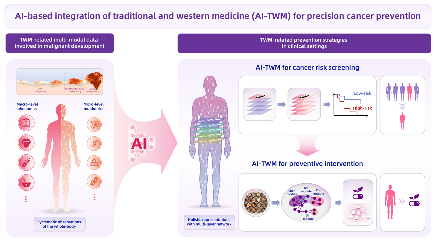 华体会娱乐(中国)网11月7日电 早期有效防治对于降低肿瘤发生率至关重要,其核心挑战在于如何精准预警肿瘤发生风险并给予有效干预。中医强调“未病先防、既病防变”,在肿瘤防治上具有整体观、治未病等特色理论与丰富的临床实践经验。随着生物医学研究进入人工智能时代,如何运用AI前沿技术,深入挖掘中医药在肿瘤防治上的特色理论与实践经验,形成中西医融合的肿瘤防治新范式?这既是中西医学面临的共性难题,也是人工智能与信息科学面临的重大挑战。