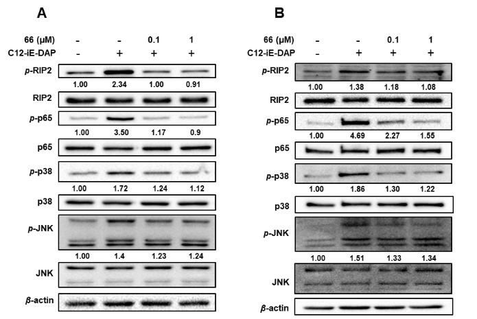 NOD1信号通路被激活后能引起IL-6、TNF-α及CXCL1/8等炎性细胞因子的表达和分泌。RT-qPCR实验结果显示化合物66可显著抑制由C12-iE-DAP及H.pylori刺激引起的免疫细胞(THP-1, BMDM)及胃上皮细胞(AGS)炎症因子的转录水平,说明66具有较好的体外抗炎效果(图4)。
