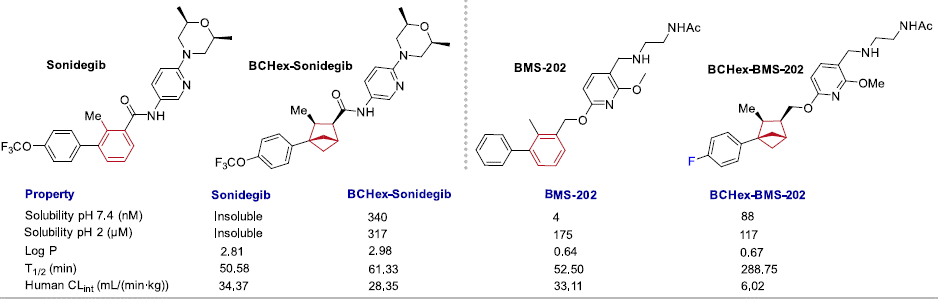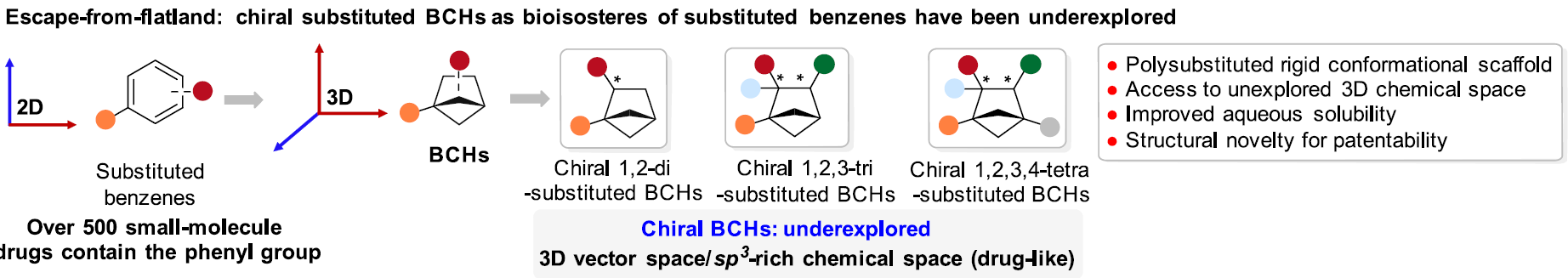 华体会娱乐(中国)网12月13日电 在药物化学研究中,根据“逃离平面”概念,提高sp³杂化碳的比例和手性碳的数目可以增加候选药物分子的复杂性,从而提高其临床成功率;因此三维(3D)、饱和的、桥环类化合物在药物化学中受到广泛关注,其中BCHs能够作为多种不同取代苯基的生物电子等排体;然而,目前手性BCHs的合成方法尚未得到充分研究,且手性BCHs替代生物活性分子(或小分子药物)中的苯环及其生物活性研究还未见文献报道(图1)。