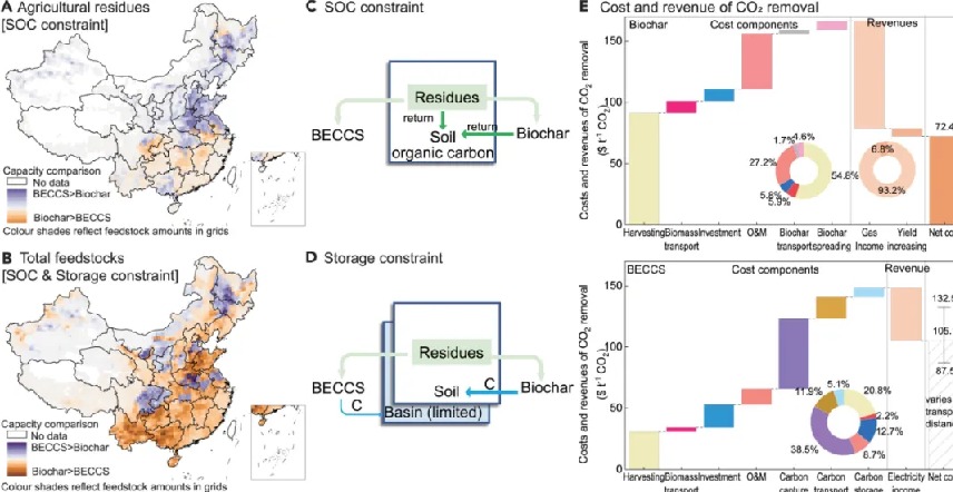 BECCS是一种领先的碳移除技术,它通过燃烧等过程将生物质转化为电力或其他能源产品,同时以较高效率捕集二氧化碳并封存。然而,BECCS受限于管道基础设施及盆地二氧化碳注入能力,难以满足碳中和减缓路径下的碳移除需求,并面临大规模利用作物残留物或种植能源作物造成土壤退化的风险。生物炭(Biochar)则不受到封存限制,碳通过生物质热解过程被封存在生物炭中,生物炭还田后可以长期不分解,并且产生改善土壤健康等共同效益。然而,生物炭的碳封存能力低于BECCS,并且将与BECCS竞争有限的生物质资源。鉴于BECCS 和生物炭各有优势,二者联合部署有可能在遵守各自限制因素的同时最大限度地发挥碳移除潜力,同时降低对土壤健康和粮食安全的环境影响。