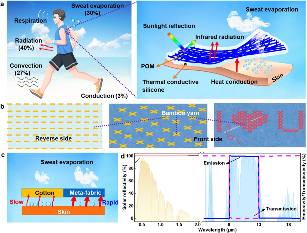 第四,研究团队开发了一种集成优异排汗性能、热传导性能和辐射制冷降温性能于一体的超凉爽织物。中国特殊的气候条件,如温带和亚热带地区夏季的高温湿热环境,对个体舒适性和能源使用提出了更高要求。辐射制冷是一种新兴的零能耗热管理技术,对高温天气户外场景中的人体降温具有重要意义。然而,现有的纺织品受限于固有降温功率低、疏水性高和导热性差等问题,尤其是炎热夏季伴随的排汗和散热问题,难以在实际应用中实现令人满意的降温效果。研究团队开发了一种集成优异排汗性能、热传导性能和辐射制冷降温性能于一体的超凉爽织物。该织物正面采用聚甲醛(POM)纳米纺织品作为选择性辐射制冷发射体,反面采用亲肤导热硅胶作为热传导体,并采用图案化的竹纱线(一种从竹子中提取的纤维素纤维,具有良好的亲水性)作为汗液传输通道。这种织物能够迅速(几秒钟内)从皮肤表面吸收汗水并传输至织物外侧,同时织物导热系数高达1.5 W/(m·K),防止人体在高温户外出现过热现象,表现出优异的人体降温效果(比没有汗液时的超织物低10.9 ℃)。此外,在不排汗的情况下,所制备的超凉爽织物仍能够比商用棉织物实现9.6 ℃的降温,这项研究为设计具有实际应用价值的个人热管理纺织品提供了一种新的思路。该工作以“集成针织导汗和涂层导热的辐射制冷超织物”(Radiative Cooling Meta-Fabric Integrated with Knitting Perspiration-Wicking and Coating Heat Conduction)(论文4)为题,与2024年12月31日发表于《美国化学会·纳米》(ACS Nano)。