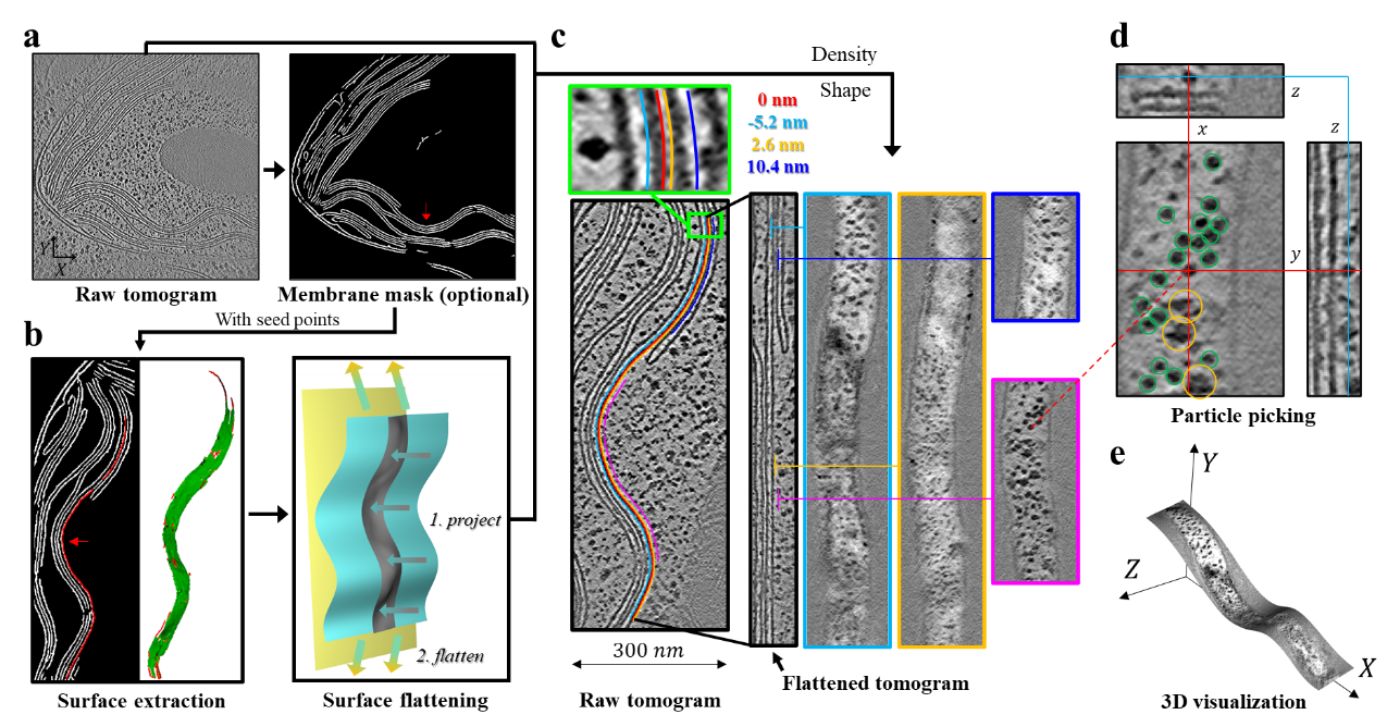 1月8日,华体会娱乐平台生命学院李雪明副教授课题组在《自然·通讯》(Nature Communications)在线发表题为“MPicker:冷冻电子断层成像中膜蛋白的可视化与挑选”(MPicker:visualizing and picking membrane proteins for cryo-electron tomography)的研究论文。该论文报道了一种基于“膜展平”的方法,通过在“展平tomogram”中进行操作来降低膜蛋白可视化与挑选的难度(图1)。该方法首先通过膜分割或者手动标注定位感兴趣区域(一片膜),然后在tomogram中对这片膜及其周围的区域进行变形处理,最终把这个局部区域展平为一个包含平整膜结构的新tomogram,也就是展平tomogram。在这个新生成的展平tomogram中,原本弯曲的膜会变成一个平板,膜厚度与蛋白取向局部保持不变。展平tomogram中每一层二维截面都对应一个平行于膜的等距面,使得膜表面的蛋白信号可以轻易地以二维图像的形式被展示。这起到了降维的效果,降低了膜蛋白分析的空间复杂性,改善了膜上和膜周围蛋白质的可视化效果。