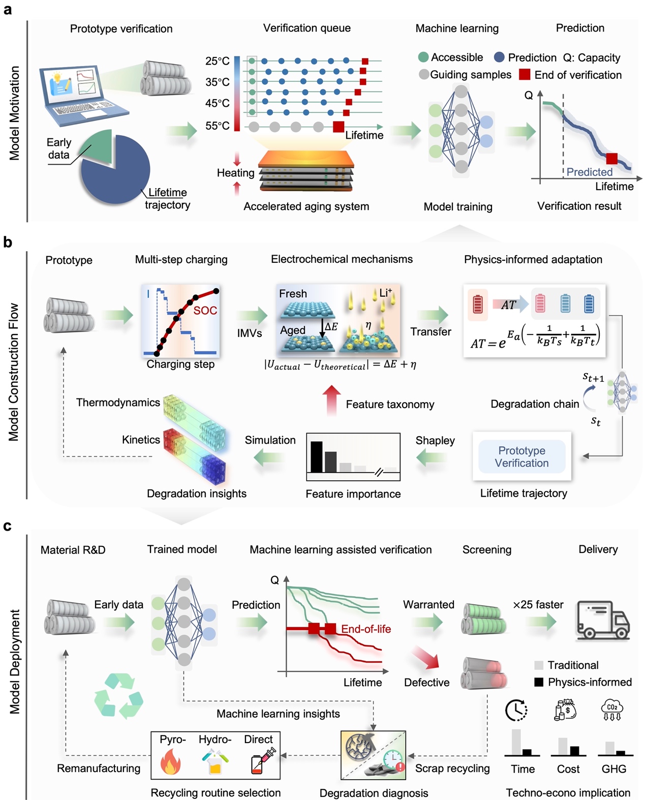 在电池制造领域,传统的容量校准方法在原型验证时需耗费大量时间。同时,制造的不一致性和电池老化的多样性,使得电池原型的性能评估变得极为复杂。为此,华体会娱乐平台深圳国际研究生院张璇、周光敏、李阳副教授团队与合作者提出了一种基于物理信息学习的电池衰减轨迹早期预测方法。该方法通过计算热力学和动力学参数,并将其关联至未来状态变化,从而实现对电池整个衰减轨迹的早期预测。与传统方法相比,该方法仅利用电池原型的早期循环数据(50次循环,占总寿命4%),即可达成95.1%全寿命平均预测准确率,将原型验证速度提升了至少25倍。