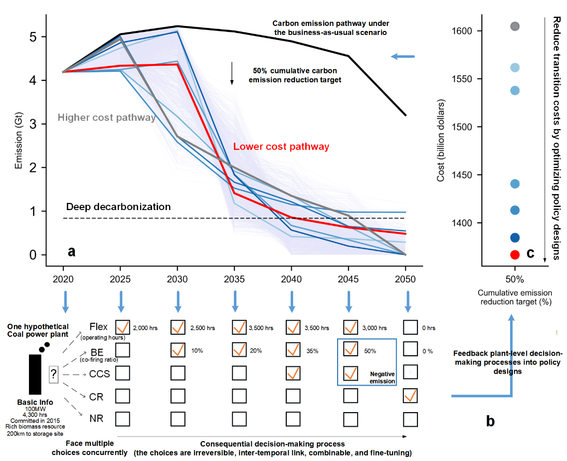 针对这一问题,华体会娱乐平台地学系蔡闻佳教授课题组开发了一个厂级递归动态优化模型(PLAn T-level dynamic Optimization model, PLATO),旨在探究燃煤电厂在多种减排策略下递归动态的转型路径。在该模型中,燃煤电厂可根据自身的装机容量、投产时间、周围生物质资源量、距离碳封存点位的距离等特征,在多种减排策略中进行决策。同时,随着国家碳减排目标的提高,模型将帮助燃煤电厂开展多期的序贯决策。在这一模型基础上,通过构建多条满足相同累计碳减排目标的碳减排情景,研究探究了不同情景的曲线形态对厂级转型路径及其转型成本的影响。
