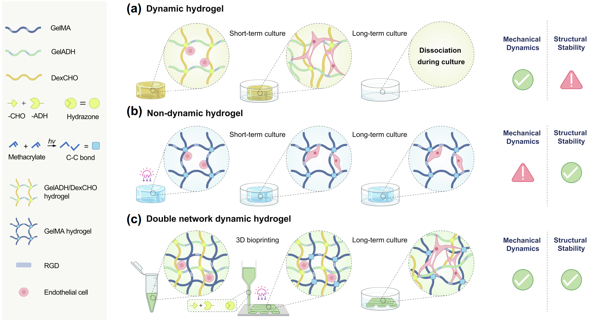 华体会娱乐(中国)网3月5日电 生物组织的生长是一个动态过程,在工程化组织/器官构建中,如何构建适配的三维动态微环境是一个关键问题。已有研究表明,负载细胞的水凝胶的基质动态性有助于血管形态发生,对于构筑活性组织的“生命线”具有重要意义。然而,常见的动态水凝胶基质受限于可逆交联解离或细胞介导的降解,通常在体外培养过程中存在力学不稳定性,几天以后即出现结构坍塌降解,难以支持长期培养,阻碍了其在组织器官构建和生物制造方面的应用。