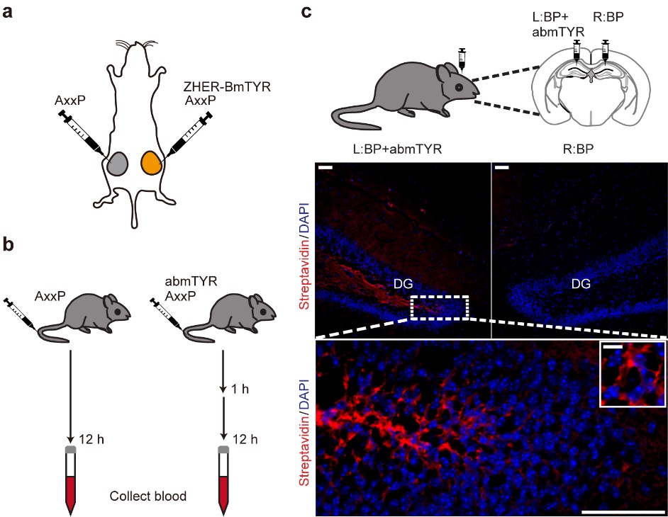 近年来,尽管邻近标记酶(proximity labeling enzymes)和小分子光催化剂技术的发展促进了细胞外蛋白质组的解析,但这些方法的体内应用仍存在局限性。辣根过氧化物酶(Horseradish Peroxidase, HRP)的标记依赖具有细胞毒性的过氧化氢(图1a),限制了其在活体动物中的直接使用;而生物素连接酶(如BioID和TurboID)虽然可以实现活体细胞内蛋白的标记,却因细胞外微环境中ATP浓度不足导致胞外标记效率受限。此外,内源性生物素或过氧化氢均可能出现较高的背景干扰。可见光在活体组织中的穿透深度有限,光催化剂在体内的应用也面临挑战。