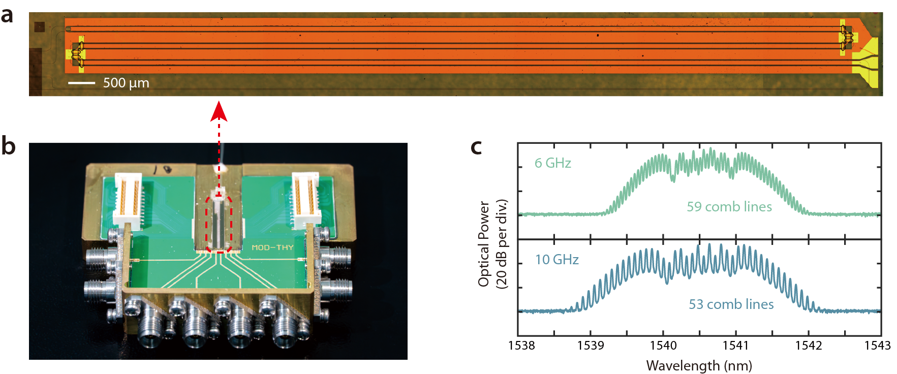 针对现有技术挑战,研究团队结合多方研究背景和优势,设计了一种基于重频可调的集成铌酸锂电光频率梳的距离测量系统。该设计使用一个电控重复频率的集成电光频梳作为光源,并在GHz范围内线性扫描电光频梳的重频,在激光雷达测量系统中可实现具有显著尖峰的拍频信号,可直接通过简单的时域寻峰算法计算物体的绝对距离,大幅提升了单次扫频过程中可以实现的距离解算次数。研究团队还为这一测量方法量身定制了集成铌酸锂直波导式折叠光路相位调制电光频梳,调制区域长度达到5厘米,尚属业内首次。通过折叠光路、倒角电极、空气桥等技术的运用,该器件首次实现了重复频率连续任意可调谐,在10GHz重复频率下输出光频梳梳齿数量可达53根。