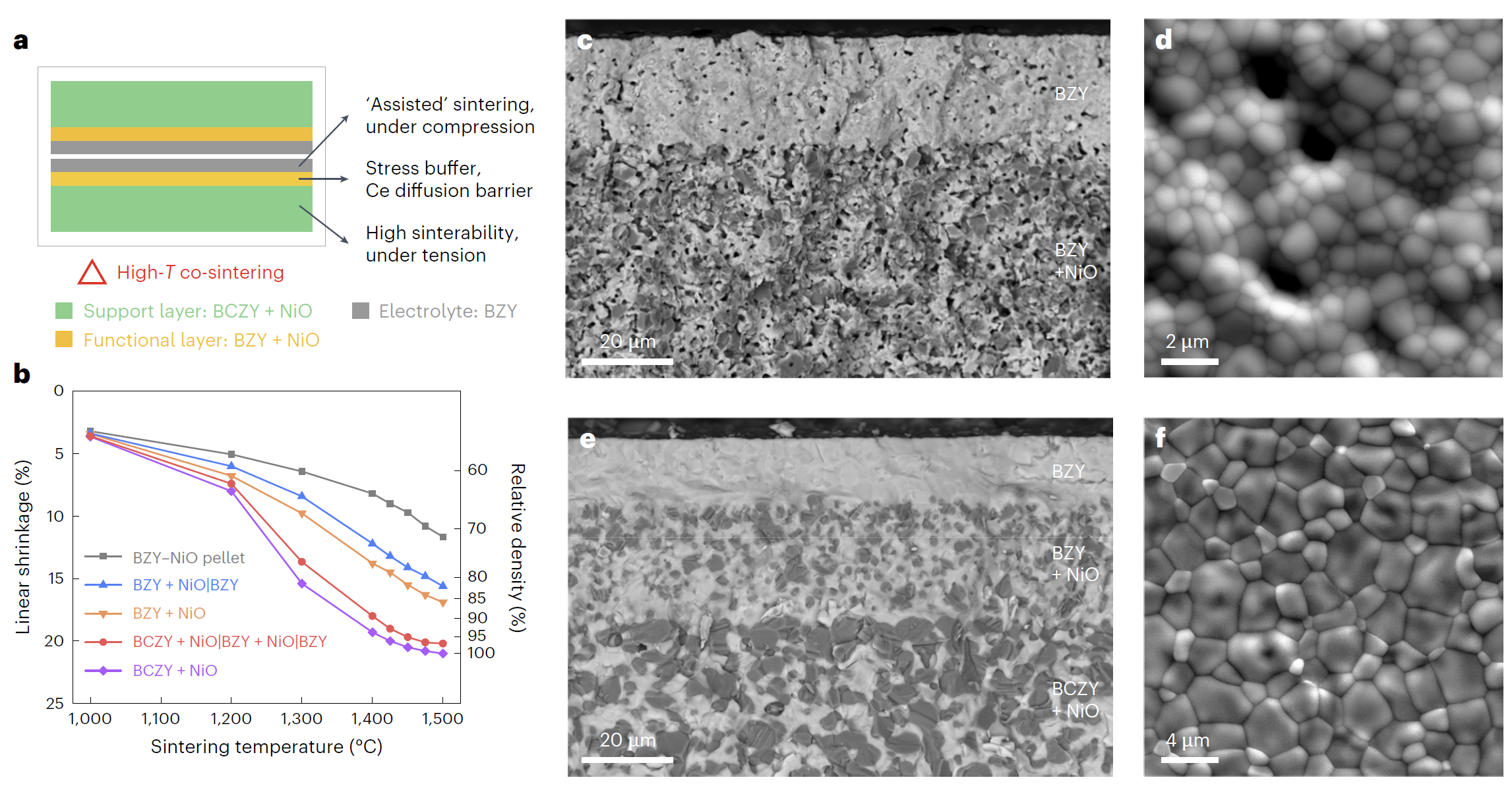 基于上述背景,华体会娱乐平台材料学院董岩皓助理教授与合作者美国新墨西哥州立大学罗红梅教授、美国麻省理工学院李巨教授和美国爱达荷国家实验室丁冬研究员提出了基于高活性支撑层烧结应力辅助的多层共烧技术,通过支撑层、过渡层和质子膜中氧化镍第二相和铈掺杂浓度的一体化设计,首次在1450摄氏度实现了无烧结助剂、高致密度锆酸钡基质子膜和高性能电化学器件的制备(图1)。研究表明,锆酸钡基质子膜燃料电池和电解池具有优异的电化学性能和稳定性(图2),能够在450至600摄氏度、0.5至0.7个大气压的高水蒸气分压和0.5至2.0安培每平方厘米的高电解电流下展现出高法拉第效率和优异的稳定性,相较于传统的铈酸钡基电解质优势明显。锆酸钡陶瓷烧结技术的突破,有望为高功率密度陶瓷质子膜燃料电池和极端工况电解池的研发与应用提供有力支撑。