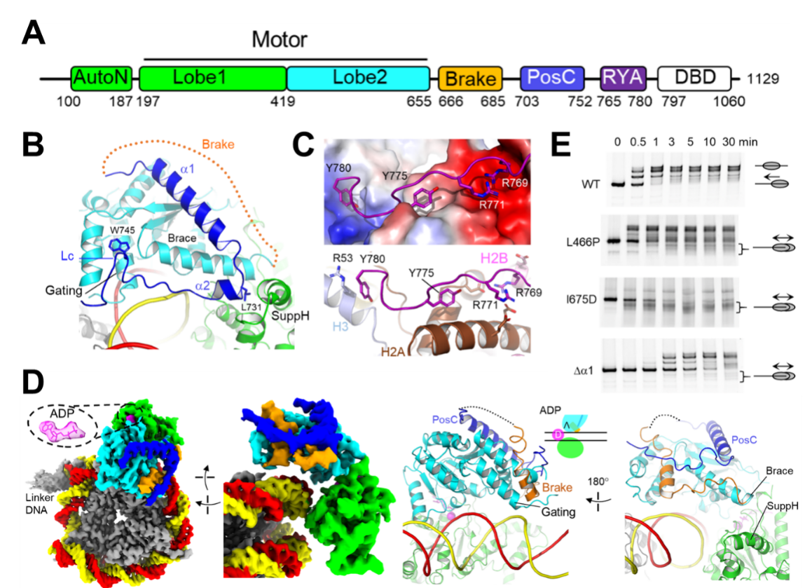 图2.ISWI调控状态的结构。(A)ISWI结构域示意图。(B)ADP+的PosC(深蓝)结构。(C)ADP+的RYA结构。上图展示组蛋白表面电势。(D)ADPB的结构,Brake(橙色)。(E)ISWI的核小体滑移(居中)活性分析。野生型(WT)ISWI感知接头DNA长度,使核小体从DNA末端滑移至中间位置,产生迁移较慢条带。三种Brake作用的突变体,破坏ISWI感知接头DNA长度的能力,从而形成迁移较快条带