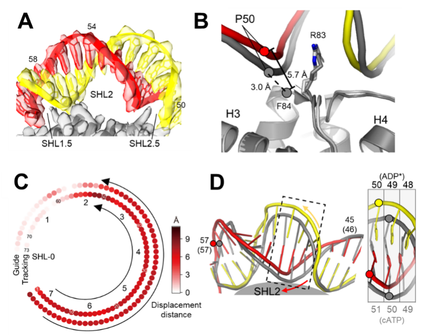 图1.存储1bp DNA隆起的ADP*状态结构。(A)ADP*状态下,DNA隆起的电镜密度图。(B)局部DNA-组蛋白相互作用分析。ATP状态,灰色;ADP*状态,彩色。在ADP*状态下,DNA与组蛋白局部相互作用被破坏。(C)相对于ATP状态,ADP*状态的DNA磷酸骨架位移距离热图。ADP*状态下,两股DNA链从入口端向核小体内部移动(箭头方向),1bp DNA形变储存在SHL2位置。(D)ATP状态(灰色)与ADP*状态(彩色)位于SHL2处的DNA结构对比