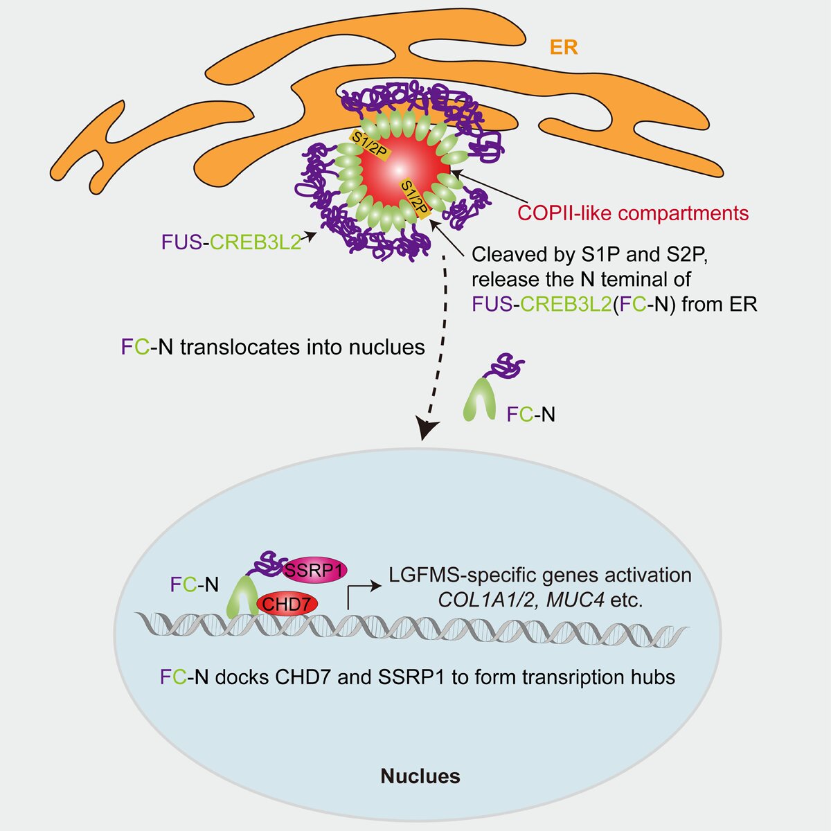 图3.FC致癌机制示意图。FC在内质网上通过LLPS形成COPII样结构。该结构滞留原本依赖经典COPII囊泡运输的跨膜蛋白酶S1P/S2P。S1P/S2P在COPII样结构中协同切割FC,释放FC的N端(FC-N)入核。FC-N入核后,与CHD7和SSRP1形成转录复合物,特异性活化LGFMS相关靶基因