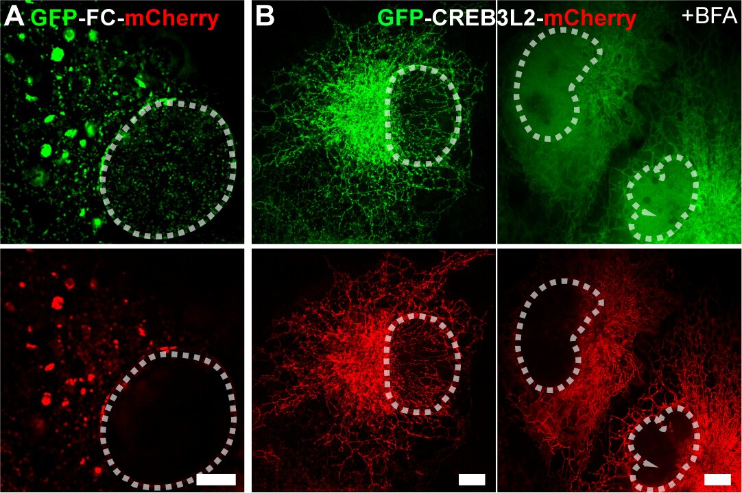 图2.(A)GFP-FC-mCherry融合蛋白Multi-SIM图像,显示FC蛋白N端片段在非刺激条件下自发发生的核转位现象;(B)GFP-CREB3L2-mCherry融合蛋白Multi-SIM图像,揭示该转录因子需经布雷菲德菌素A(BFA)处理诱导方可实现核定位。白色虚线勾勒细胞核轮廓。(比例尺:5µm)