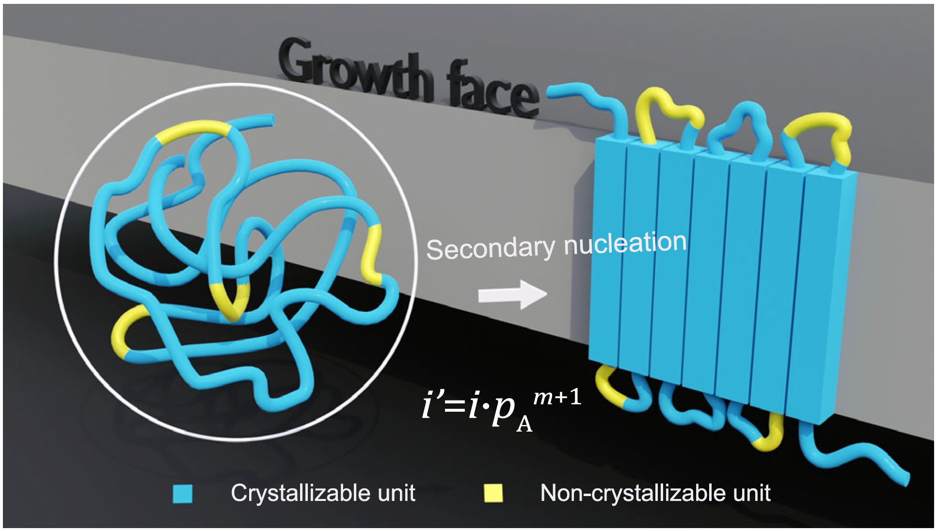 近日,华体会娱乐平台化工系徐军课题组基于无规共聚物结晶成核过程中对分子链上可结晶单元随机选择的概率模型(图1),建立了基于成核动力学测定临界晶核尺寸的理论方法,成功测定了稀溶液中聚丁二酸丁二酯单晶生长晶面上的次级临界晶核尺寸。