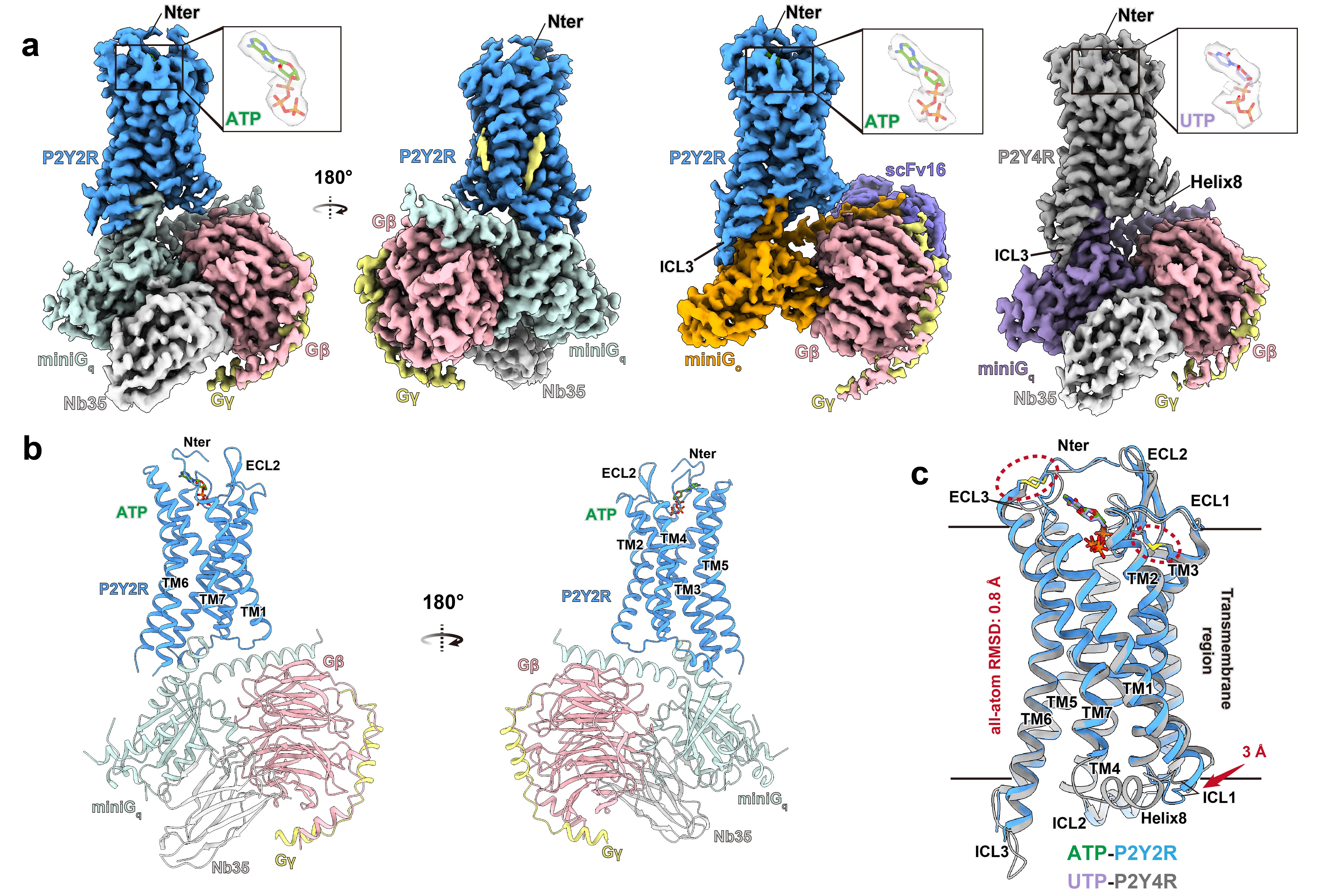 图2.ATP-P2Y2R-Gq, ATP-P2Y2R-Go和 UTP-P2Y4R-Gq复合物的冷冻电镜结构