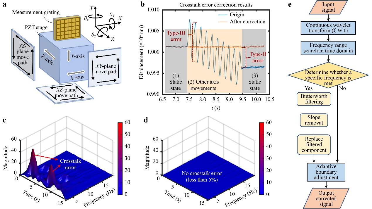 李星辉团队提出并验证了一种集成化零死区外差光栅干涉系统,采用空间对称双光路架构,实现频率与偏振混叠误差的根源性消除,并构建了基于小波分析与巴特沃斯滤波器的误差校正算法,将串扰误差控制至5%以下。该系统采用紧凑式设计,整体尺寸为90×90×40mm³,结合3自由度纳米压电平台,实现了高精度实时多维位移测量。