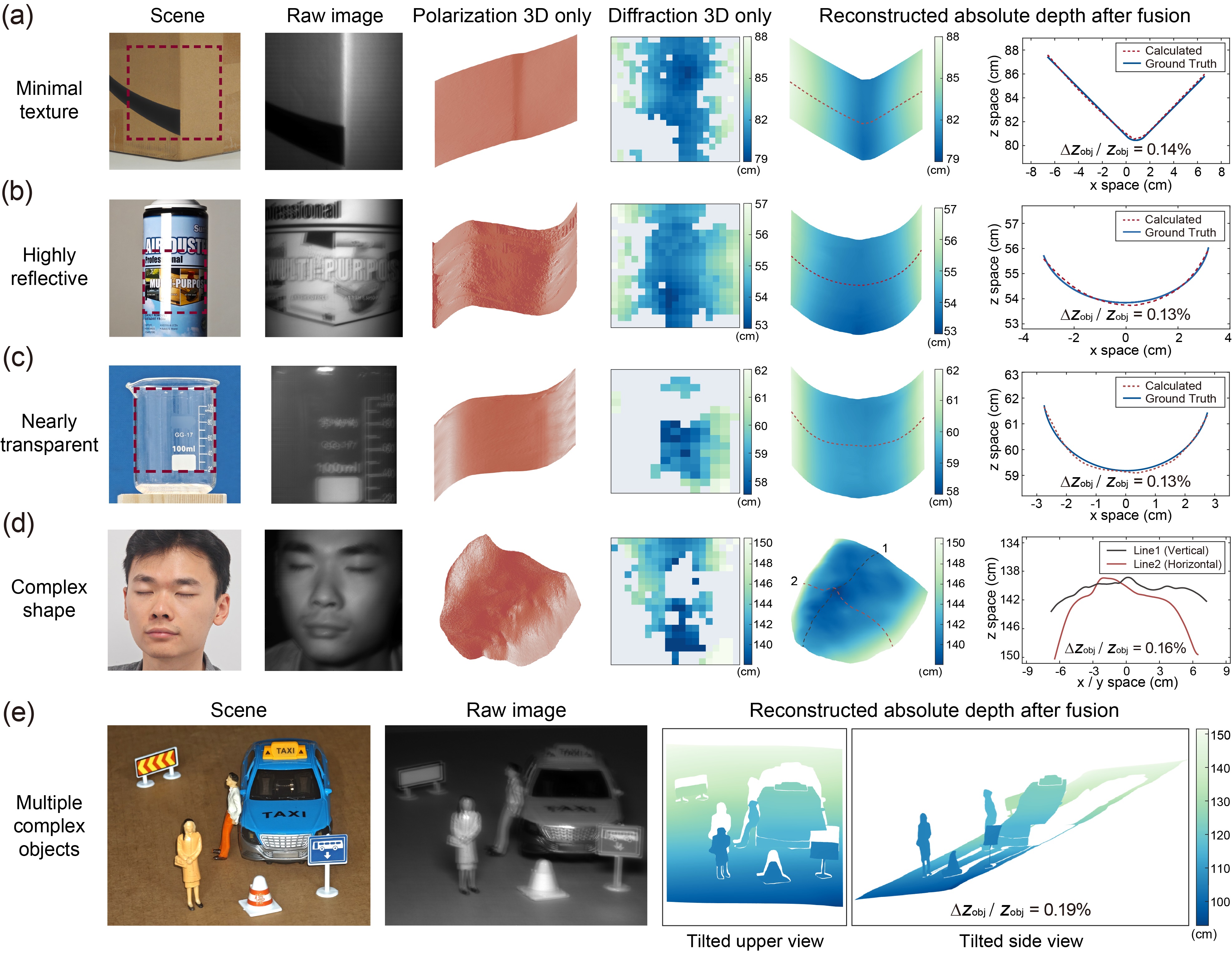 EM3D系统对多种传统易失效场景的三维成像结果图2所示。这些场景包括弱纹理的纸箱、高度反光的金属罐、近乎透明的玻璃烧杯、具备复杂面型的活体人脸以及多个复杂物体。结果显示单一基于衍射或偏振深度线索获取的三维结果是不准确而粗糙的,而EM3D系统融合获得了精细的(百万像素)三维点云,所有场景的绝对深度误差均在0.2%以内。