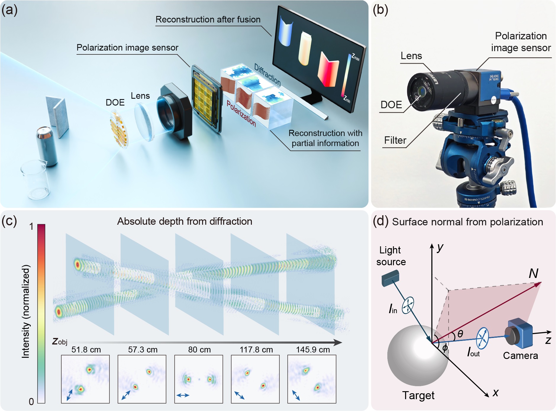 图1.基于衍射与偏振深度线索融合拓展单目三维成像系统框架