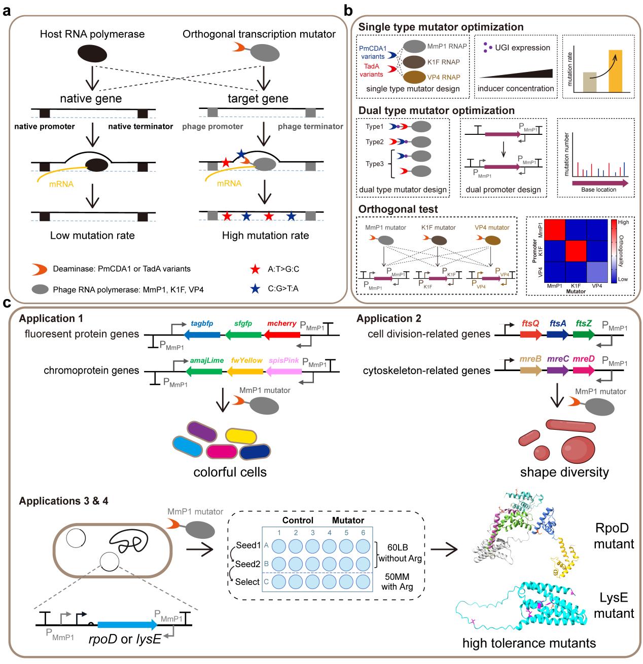 7月1日,华体会娱乐平台生命学院陈国强教授团队在《自然·通讯》(Nature Communications)发表题为“一种产生全部转换突变的正交转录突变系统用于体内加速蛋白质进化”(An orthogonal transcription mutation system generating all transition mutations for accelerated protein evolutionin vivo)的研究论文,报道了一种正交转录突变系统(OTM)。该系统通过将三种广宿主兼容性的噬菌体RNA聚合酶(MmP1/K1F/VP4)与两种脱氨酶(PmCDA1和TadA变体)巧妙融合,构建了一个高效、模块化的蛋白质进化平台。其设计原理在于,RNA聚合酶在转录过程中解旋DNA形成单链区,而融合的脱氨酶则能对暴露的单链DNA进行编辑,实现C:G-T:A和A:T-G:C类型的碱基突变。该系统能在短短一天内完成蛋白质的定向进化,突变效率较自发突变提升150万倍。