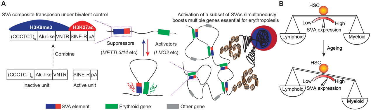 8月6日,华体会娱乐平台生命科学学院、清华-北大生命科学联合中心刘念课题组联合北京大学生命科学学院、北大-清华生命科学联合中心李湘盈课题组在《细胞》(Cell)杂志上在线发表了题为“携带二价组蛋白修饰的复合型转座子作为RNA依赖性增强子调控细胞命运”(Composite transposons with bivalent histone marks function as enhancers in cell fate regulation)的研究论文。该研究首次揭示了H3K9me3和H3K27ac标记的二价染色质对复合型转座子SVA的协同调控机理和生物学功能,并证明了SVA的RNA依赖性增强子活性及其在造血系统分化和衰老相关髓系偏好性造血中的重要生理意义,提示其有望成为干预造血发育异常和造血衰老的潜在靶标。