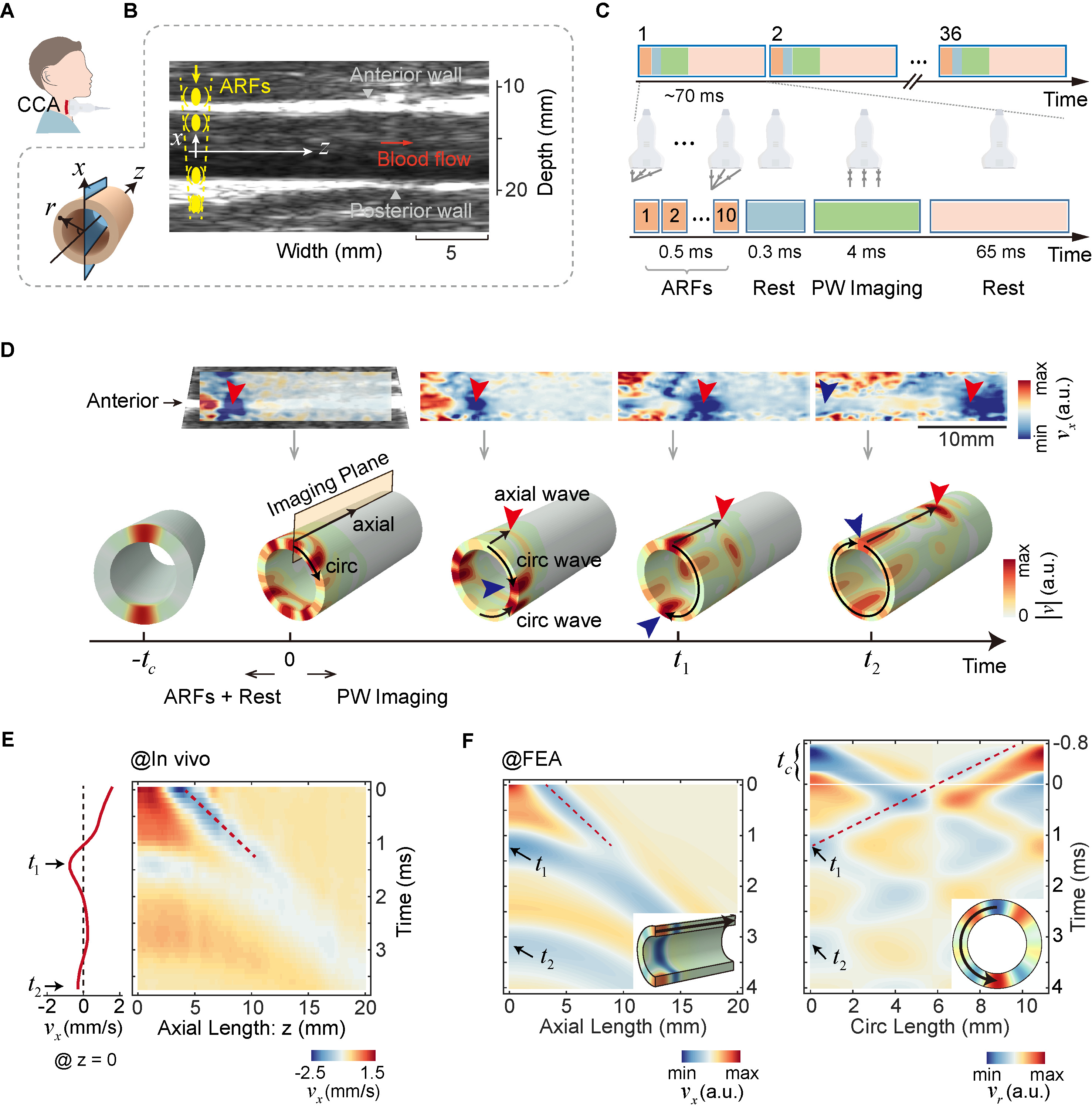 图1.动脉轴向与环向导波的激发与测量。(A)测量人体右颈总动脉的实验示意图。(B)超声成像与声辐射力激励方式。(C)超声成像的时间序列。(D)上侧:在体实验中沿动脉轴向切面成像的质点空间速度场;下侧:对应的导波传播示意图,可观察导波同时沿血管环向和轴向传播。(E)在体实验中于舒张末期从血管上壁轴向路径提取的质点时空速度图。图中虚线对应轴向导波的传播;t1时刻反映环向导波的信息。(F)有限元仿真结果,包括沿轴向路径(左侧)和环向路径(右侧)提取的质点时空速度图