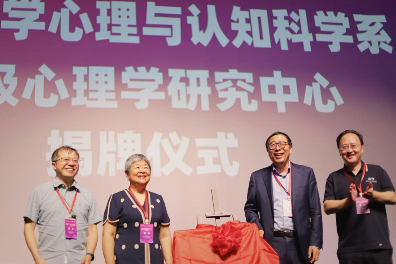 开幕式后,刘嘉、华体会娱乐平台心理与认知科学系荣休教授樊富珉、彭凯平和华体会娱乐平台心理与认知科学系副主任张丹共同为华体会娱乐平台心理与认知科学系积极心理学研究中心揭牌。