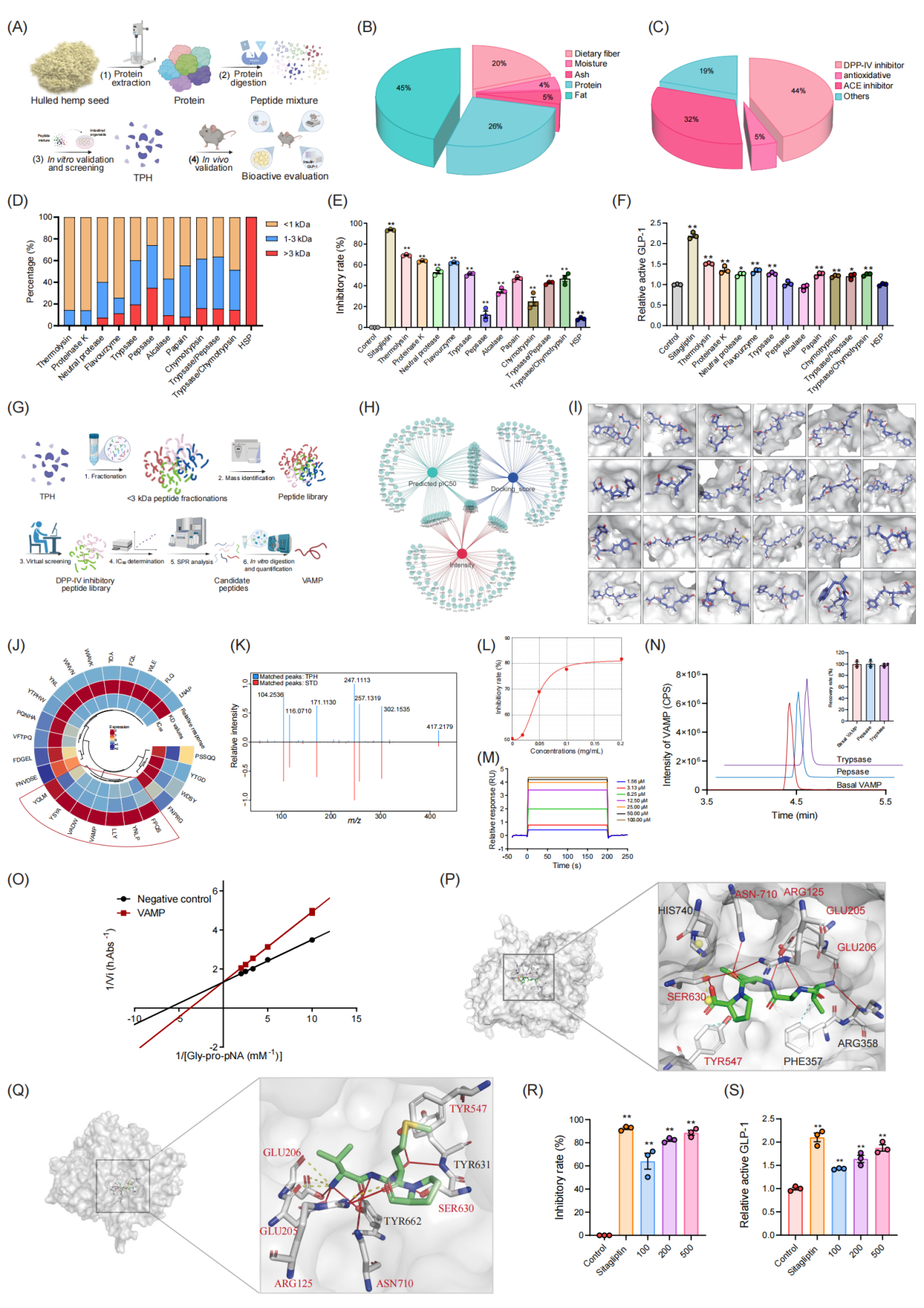 研究团队进一步通过虚拟筛选并辅以体外活性验证,系统挖掘了其中的关键活性肽序列(图2G)。结果表明,四肽VAMP表现出最强的DPP-IV抑制能力(图2H-M)。进一步模拟胃肠消化实验表明VAMP能耐受胃蛋白酶和胰蛋白酶的降解(图2N),并且VAMP在TPH中的含量最为丰富,占比0.5%左右。VAMP与DPP-IV作用动力学解析结果显示,VAMP是通过竞争性结合抑制DPP-IV活性(图2O),共晶结构解析发现,VAMP与DPP-IV活性中心可形成氢键及盐桥作用(图2P-Q)。此外,VAMP能以剂量依赖方式抑制DPP-IV活性并提升活性GLP-1水平(图2R-S)。