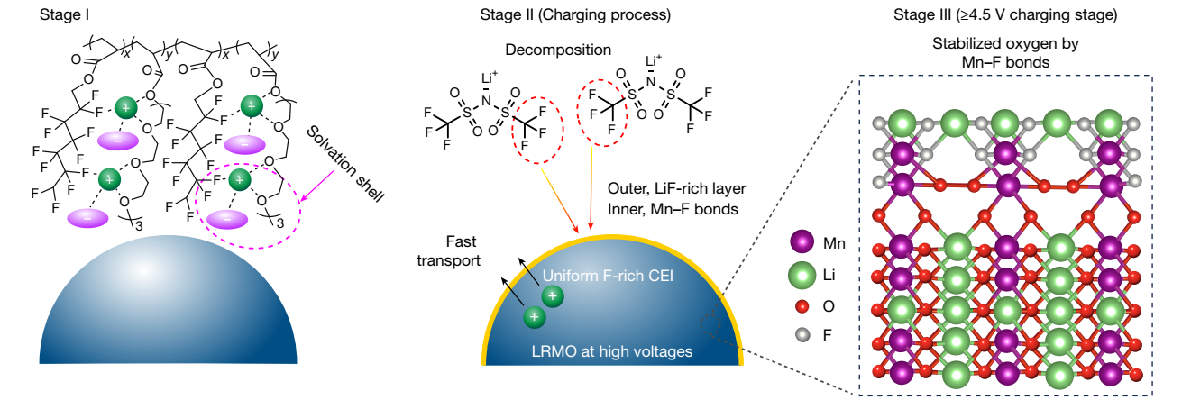 近期,华体会娱乐平台化工系张强教授团队提出“富阴离子溶剂化结构”设计新策略,成功开发出一种新型含氟聚醚电解质。该电解质通过热引发原位聚合技术,有效增强了固态界面的物理接触与离子传导能力。研究团队在聚醚电解质中引入强吸电子含氟基团,显著提升了其耐高压性能,使其可匹配4.7V高电压富锂锰基正极,实现了单一电解质对高电压正极与金属锂负极的同步兼容。基于锂键化学原理,团队构建了独特的“–F∙∙∙Li⁺∙∙∙O–”配位结构,诱导形成具有高离子电导率的富阴离子溶剂化结构,进而在电极表面衍生出富含氟化物的稳定界面层,显著提升了界面稳定性。